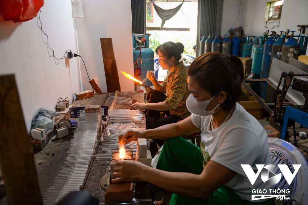 Dưới thời tiết nắng nóng của mùa hè, xưởng thổi thủy tinh của chị Tạ Thị Ngà ở xã Thống Nhất, huyện Thường Tín (Hà Nội) vẫn đỏ lửa. Ảnh: vovgiaothong.vn |