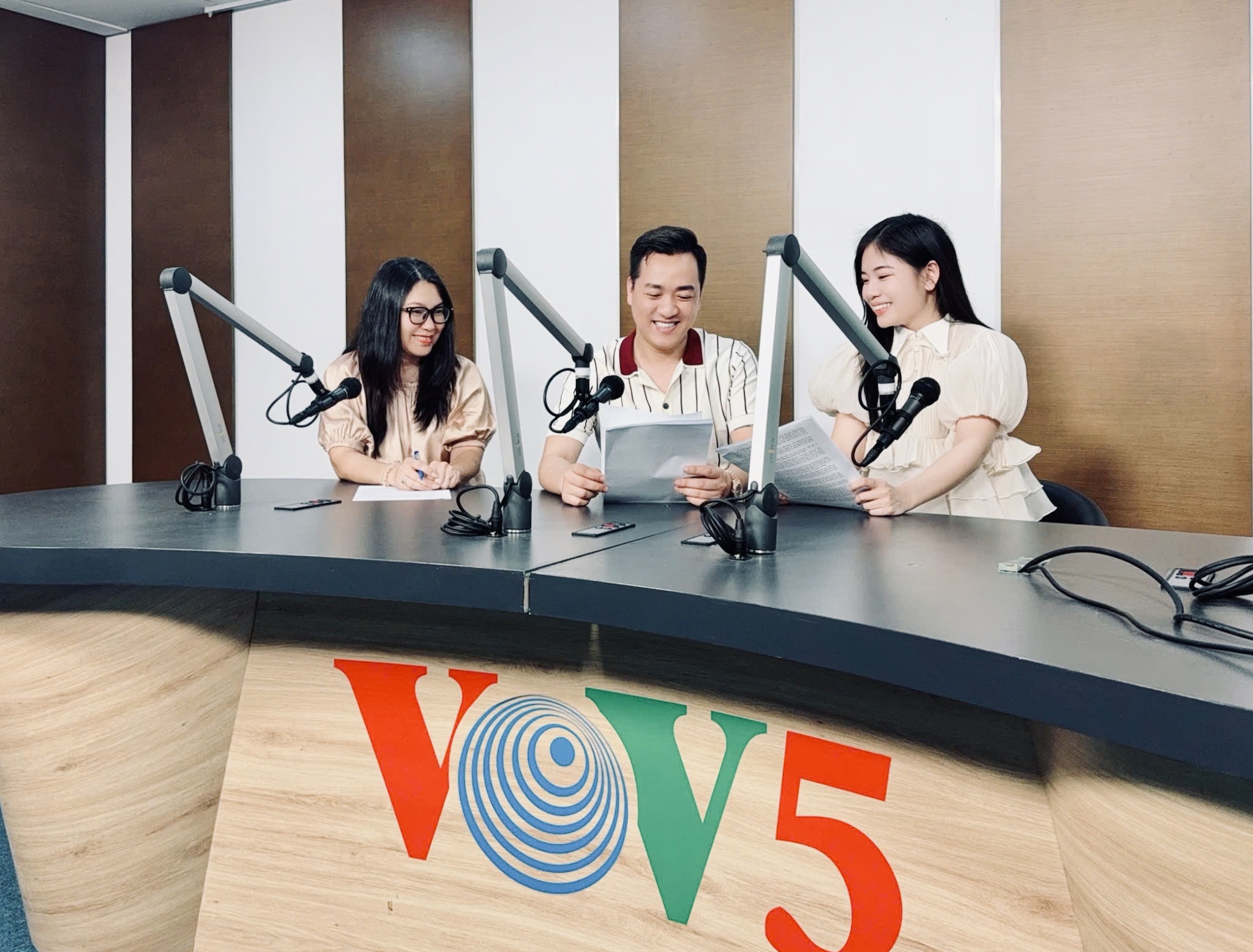 Ca sĩ Hà Thu Hằng, Đạo diễn Đức Dũng tại phòng thu của VOV5 |