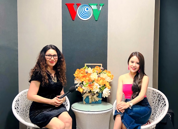 Ca sĩ Hồng Nhung Đỗ (bên phải) trong phòng thu của VOV5 |