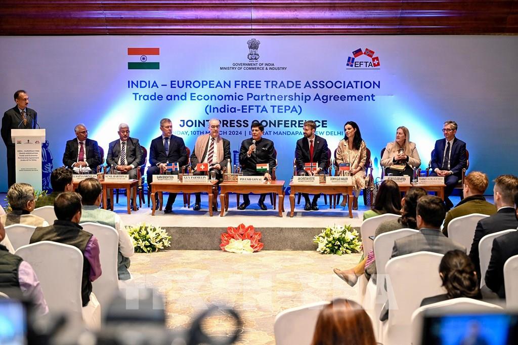 Các đại biểu tham dự lễ ký kết Hiệp định Đối tác Kinh tế và Thương mại (TEPA) giữa Ấn Độ và Hiệp hội thương mại tự do châu Âu (EFTA) ở New Delhi ngày 10/03/2024. Ảnh: ANI/TTXVN |