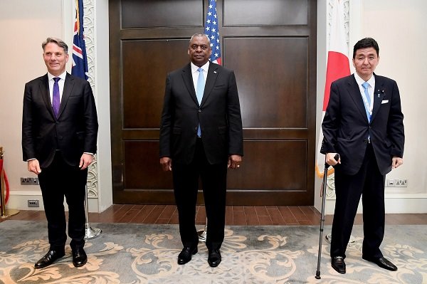 Từ trái sang: Phó Thủ tướng kiêm Bộ trưởng Quốc phòng Australia Richard Marles, Bộ trưởng Quốc phòng Mỹ Lloyd Austin và Bộ trưởng Quốc phòng Nhật Bản Kishi Nobuo. Nguồn: The Jiji Press |
