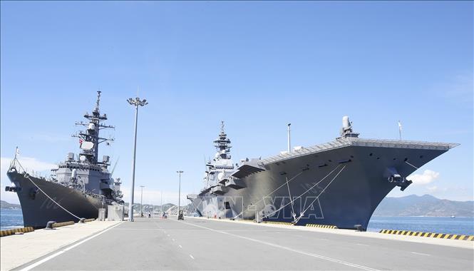 Tàu khu trục trực thăng IZUMO và tàu khu trục SAMIDARE cập cảng quốc tế Cam Ranh. Ảnh: TTXVN