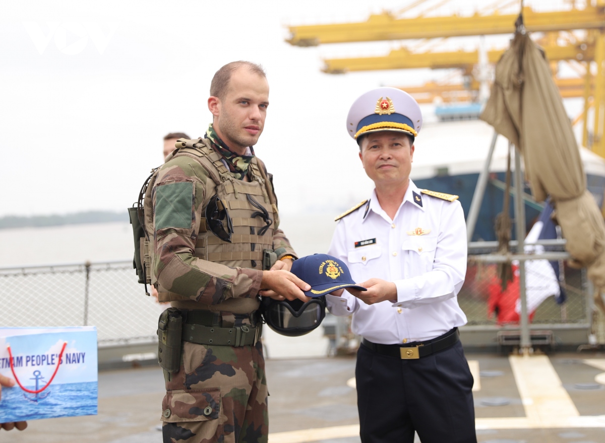 Đại diện thủy thủ đoàn tàu PRAIRIAL và Hải quân Việt Nam trao quà lưu niệm sau buổi huấn luyện. Ảnh: VOV |