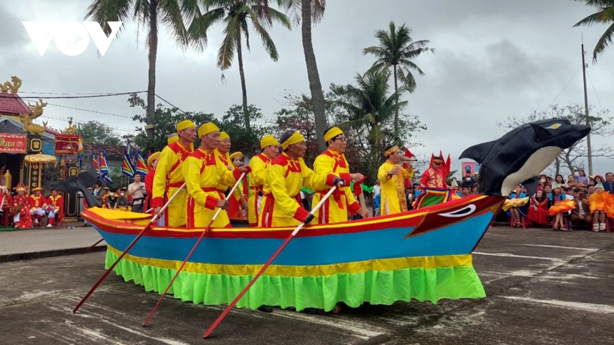 Nghi thức chèo cạn tại lễ Cầu của người dân vùng biển Cảnh Dương. Ảnh: VOV