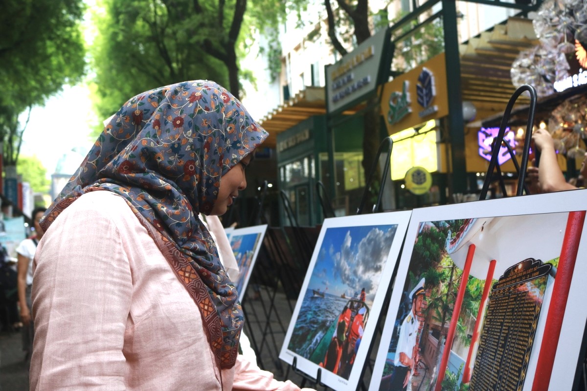 Khách nước ngoài thích thú nhìn những hình ảnh tại triển lãm. Ảnh: Phan Trinh/VOV