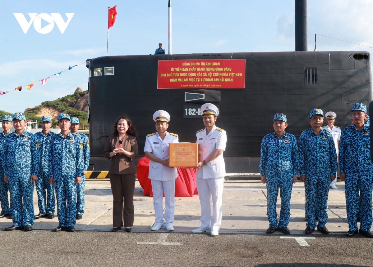 Phó Chủ tịch nước Võ Thị Ánh Xuân tặng quà Lữ đoàn tàu ngầm 189. Ảnh: VOV |