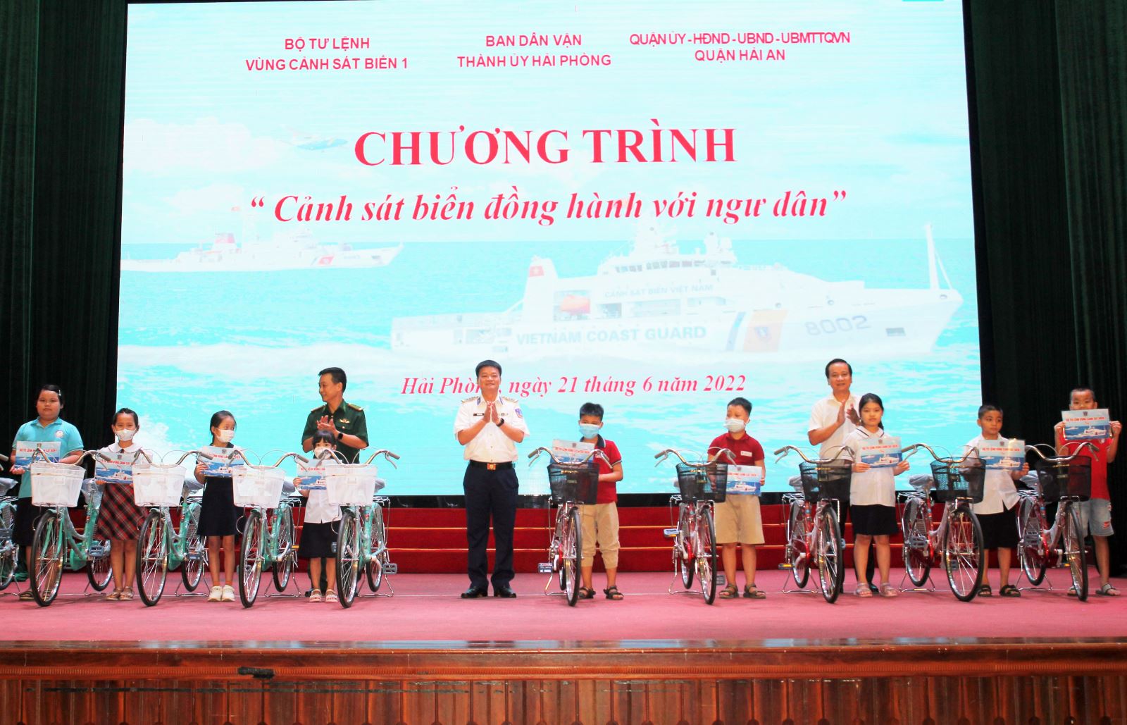 Thủ trưởng Bộ tư lệnh Vùng cảnh sát biển 1, Ban Dân vận Thành uỷ Hải Phòng và Bộ Chỉ huy BĐBP Hải Phòng tặng xe đạp cho các cháu học sinh vượt khó học giỏi quận Hải An. Ảnh: Mạnh Thường/TTXVN |
