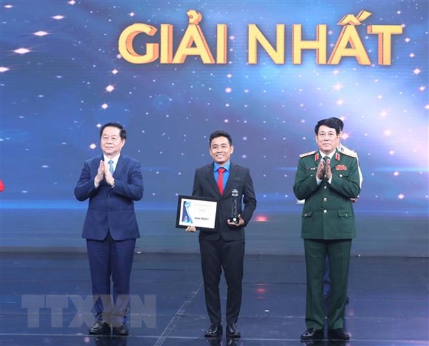 Đại tướng Lương Cường - Ủy viên Bộ Chính trị, Ủy viên Thường vụ Quân ủy Trung ương, Chủ nhiệm Tổng cục Chính trị Quân đội nhân dân Việt Nam và Bí thư Trung ương Đảng, Trưởng ban Tuyên giáo Trung ương Nguyễn Trọng Nghĩa trao giải nhất cho các cá nhân. Ảnh: Phương Hoa/TTXVN |