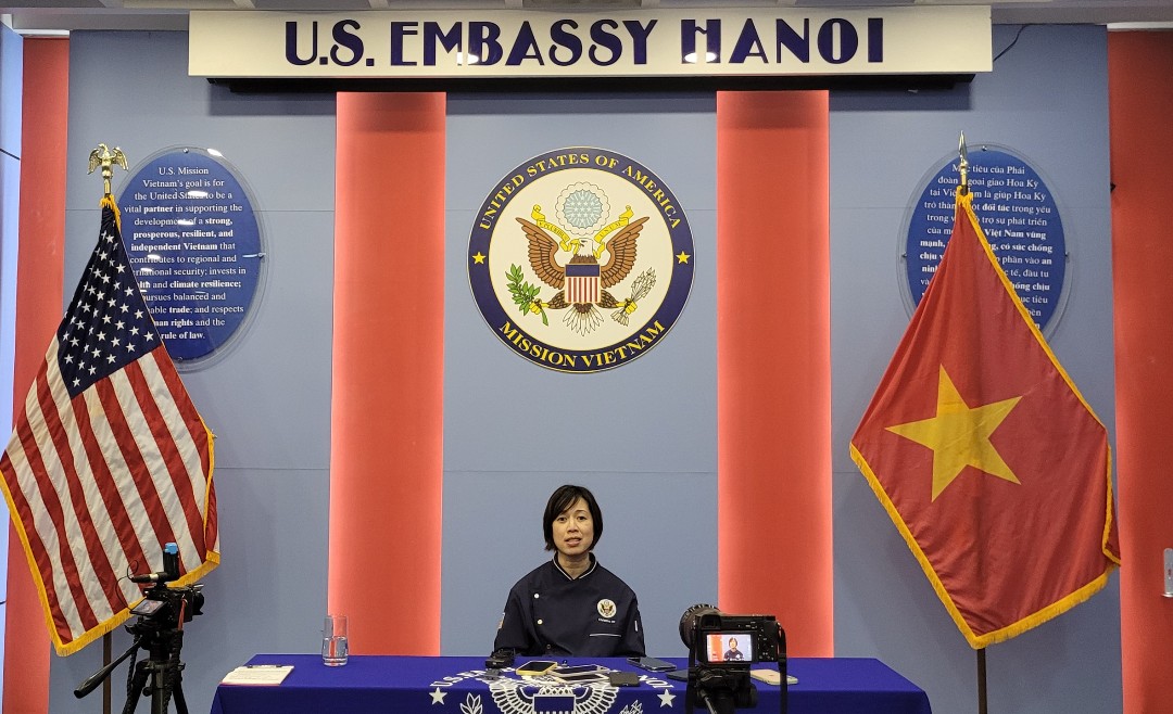 Vua đầu bếp mùa thứ 3Christine Hà, sứ giả văn hóa của Đại sứ quán Mỹ giao lưu tại Trung tâm văn hóa Mỹ. Ảnh Hà Linh