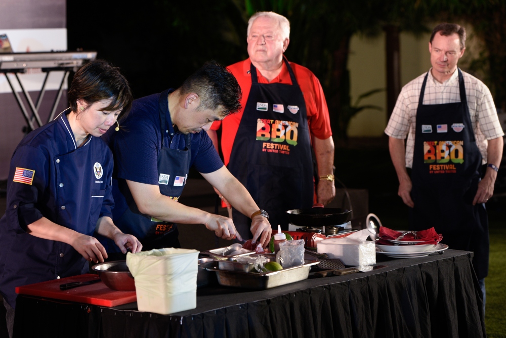 Christine Hà trổ tài món thịt bò kiểu Texas tại bữa tiệc nướng BBQ do Đại sứ quán Mỹ tổ chức. Ảnh VOV2
