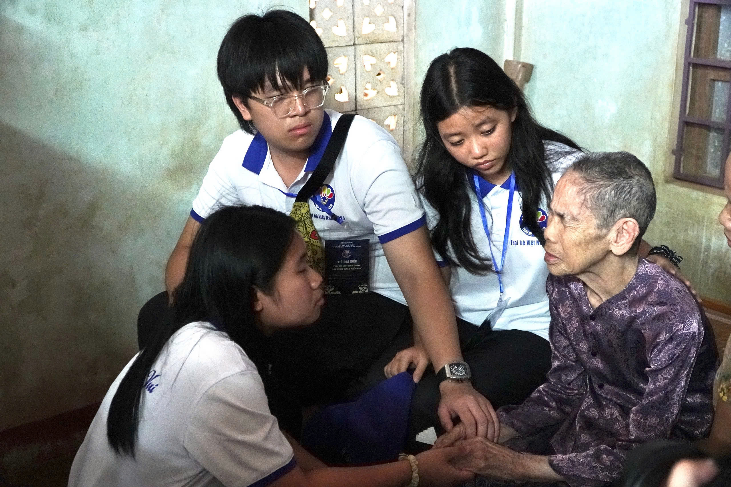 Lê Nguyễn Lưu An và các bạn trẻ kiều bào trò chuyện và tặng quà cho Mẹ Việt Nam anh hùng Nguyễn Thị Nậy ở Quảng Trị. |