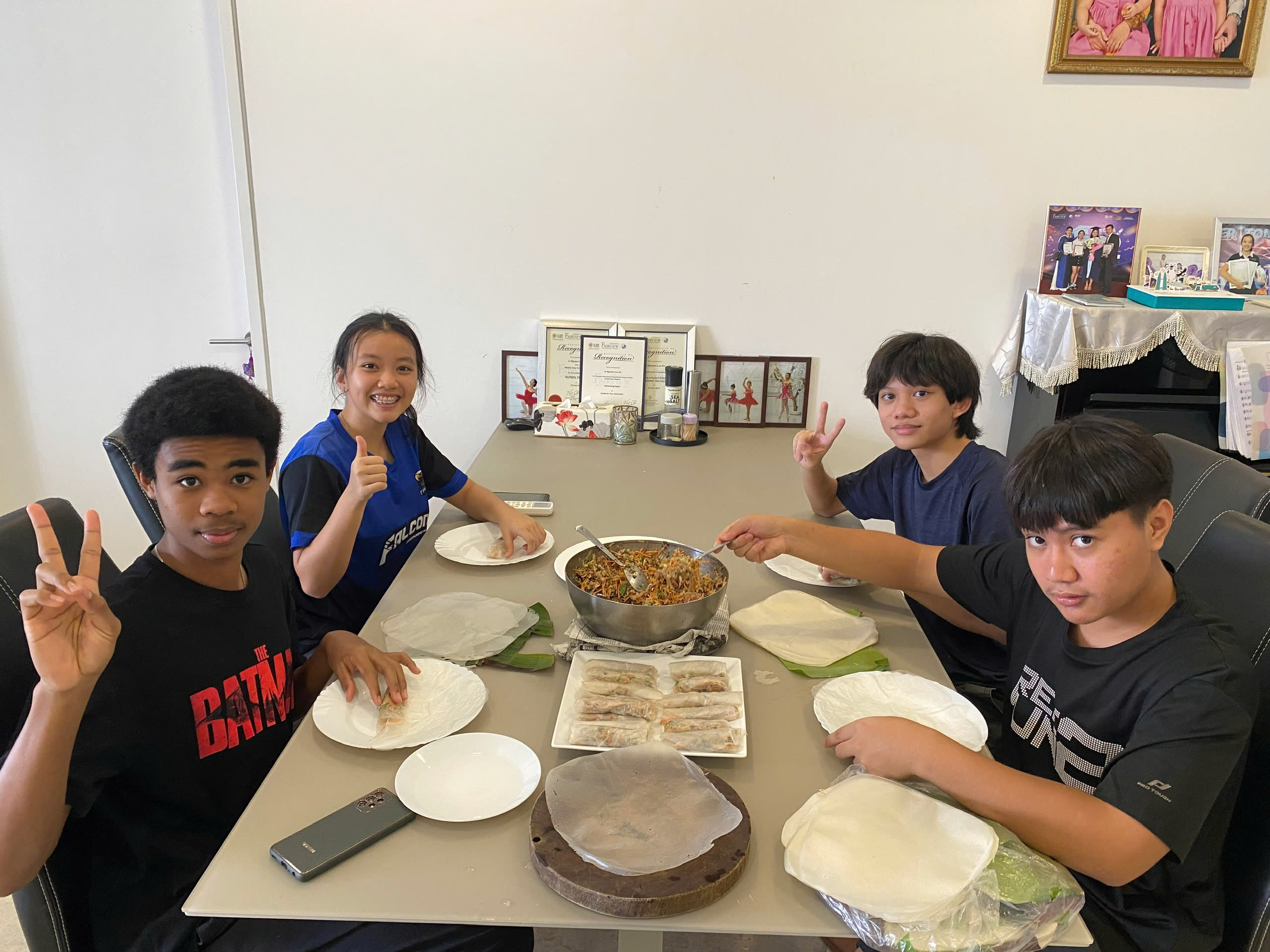 Hướng dẫn các bạn người nước ngoài làm chả giò để làm suất ăn từ thiện. |