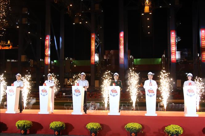 Các đại biểu thực hiện nghi thức phát lệnh làm hàng đầu Xuân Ất Tỵ 2025 tại cảng Tân cảng - Cát Lái. Ảnh: TTXVN |