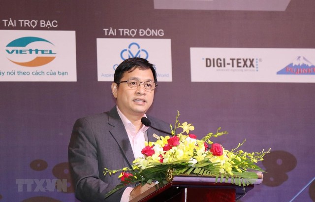 Chủ tịch Hội Tin học Thành phố Hồ Chí Minh Lâm Nguyễn Hải Long phát biểu tại buổi họp mặt - Ảnh: Tiến Lực/TTXVN |
