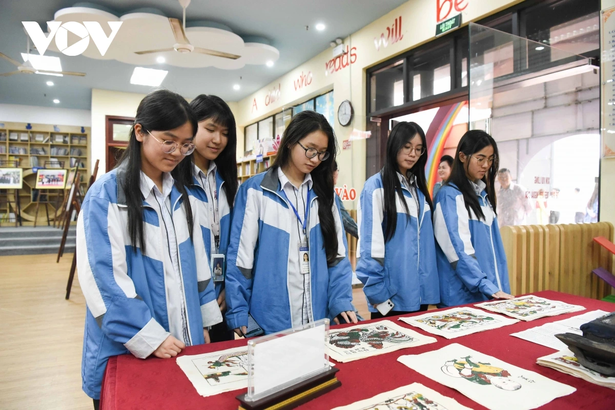 | Các em học sinh tham quan với tư liệu di sản tranh dân gian Đồng Hồ của Bắc Ninh. |