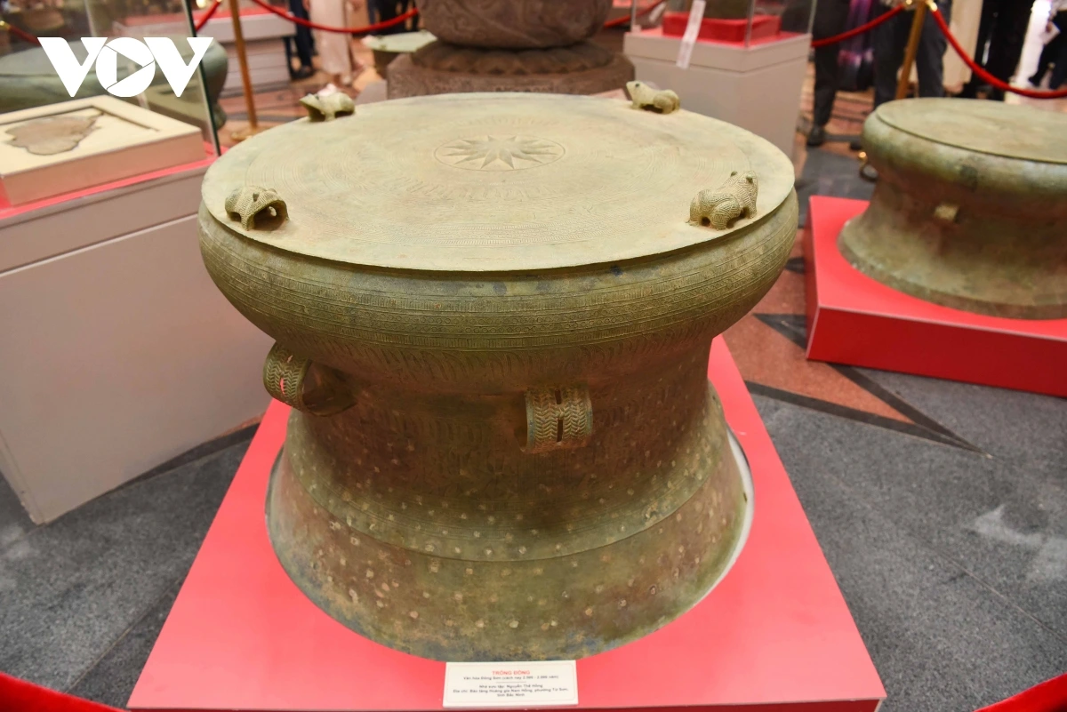 | Việc trưng bày được sắp xếp, bố cục theo 3 chủ đề: Chủ đề 1 - Cổ vật tiêu biểu thời kỳ văn hóa tiền Đông Sơn - Đông Sơn, giới thiệu những hiện vật phản ánh về bước phát triển vượt bậc về kỹ thuật kim khí của người Việt như: Trống Đồng, thạp Đồng, đồ trang sức, công cụ bằng đá… Trong đó có Bảo vật Quốc gia Thạp đồng nổi bật với trang trí hoa văn độc đáo, kỹ thuật chế tác tinh xảo. |