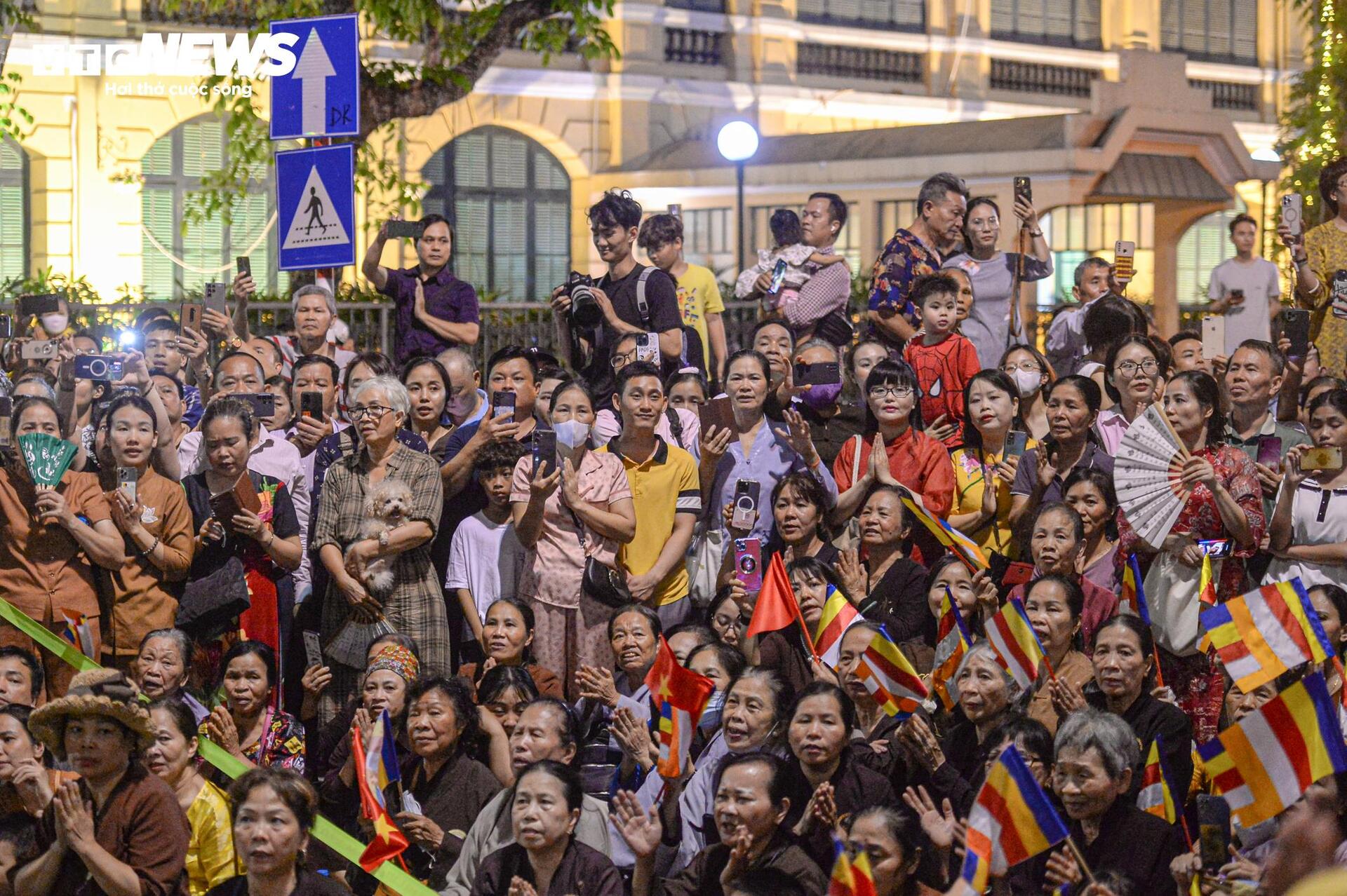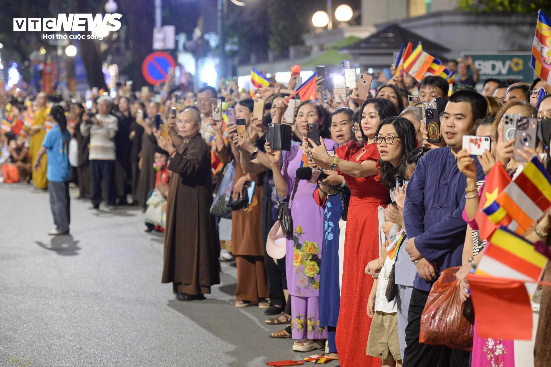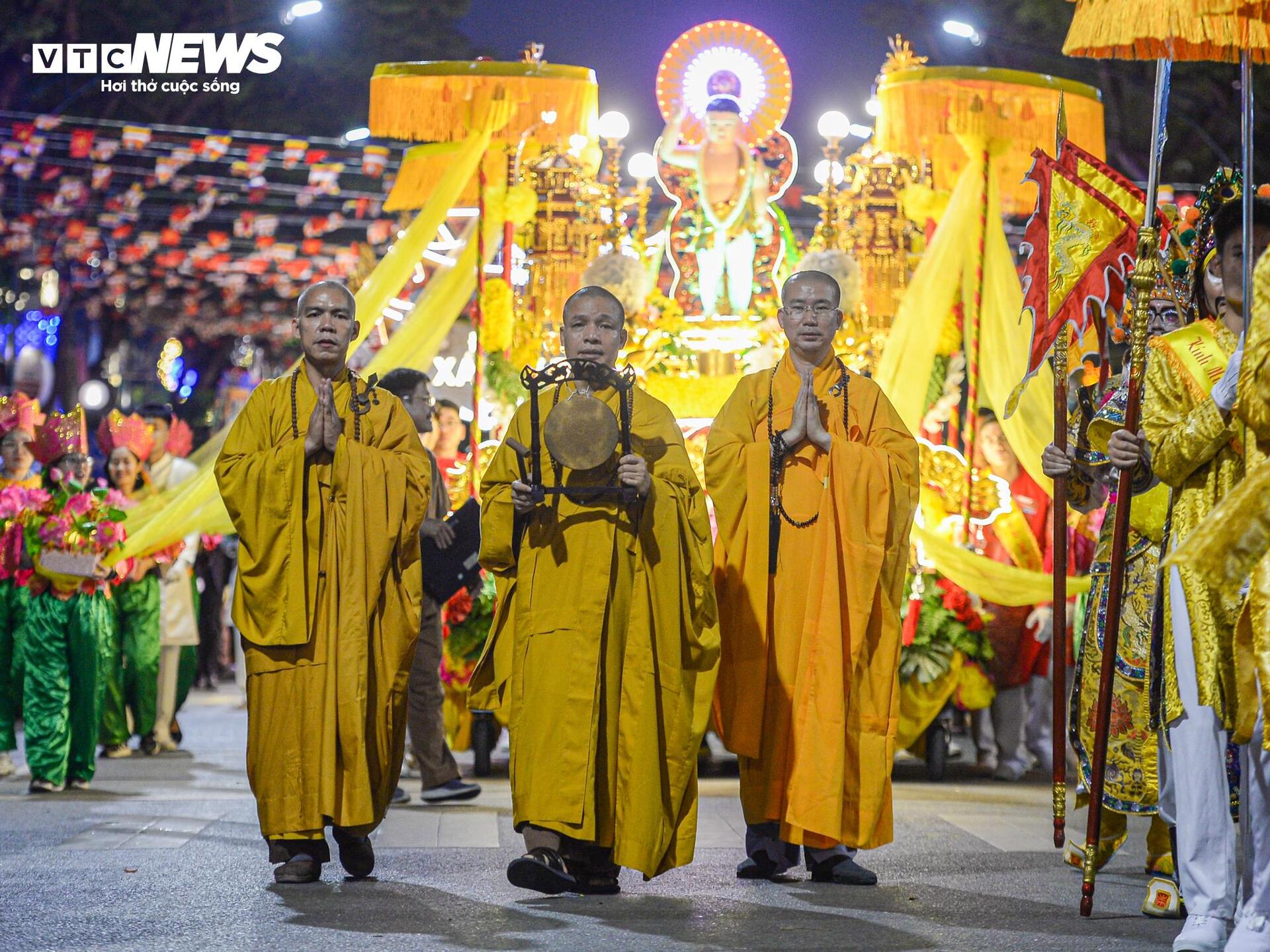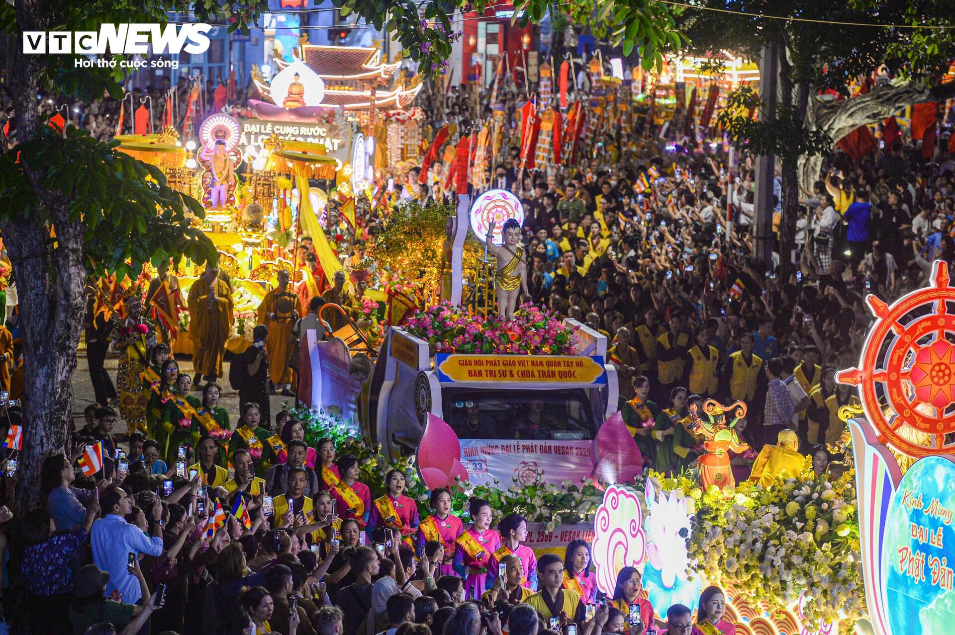 | Từ 19h, đoàn xe được trang trí công phu bằng hoa tươi, cờ Phật giáo và hệ thống ánh sáng rực rỡ bắt đầu diễu hành qua các tuyến phố: Lý Thường Kiệt, Hàng Bài, Đinh Tiên Hoàng, Lý Thái Tổ, Hai Bà Trưng… trước khi quay trở lại chùa Quán Sứ. |
