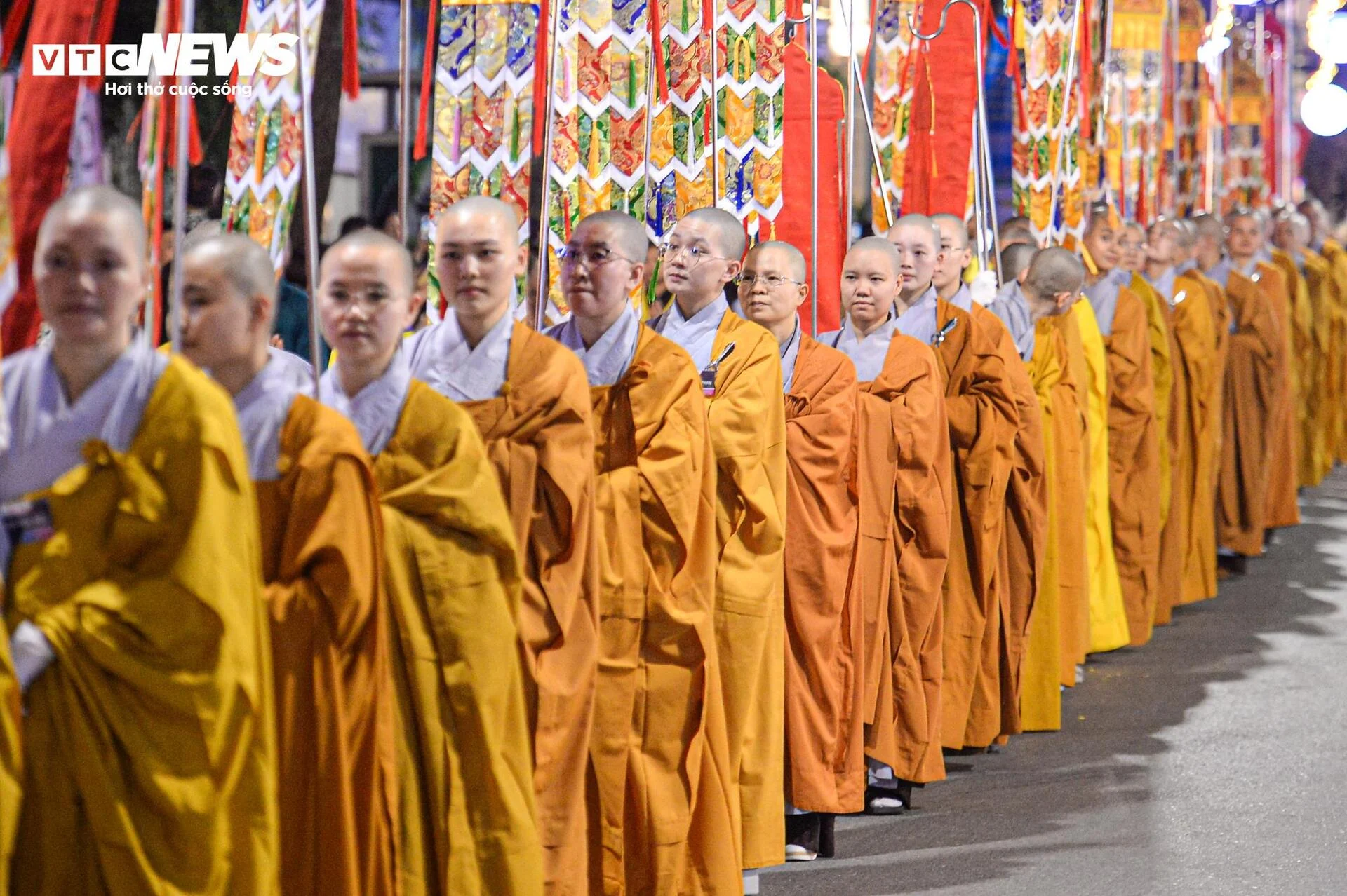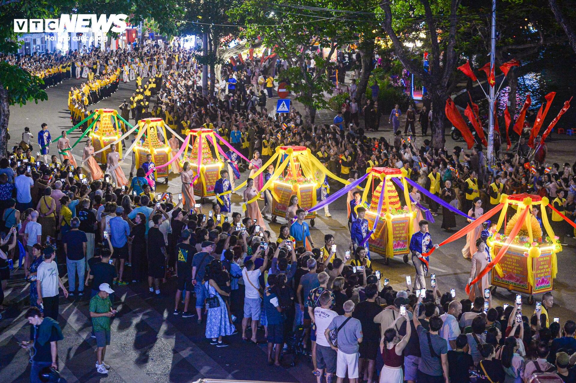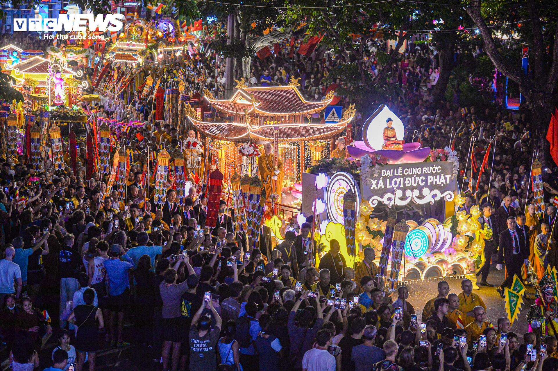| Từ 19h, đoàn xe được trang trí công phu bằng hoa tươi, cờ Phật giáo và hệ thống ánh sáng rực rỡ bắt đầu diễu hành qua các tuyến phố: Lý Thường Kiệt, Hàng Bài, Đinh Tiên Hoàng, Lý Thái Tổ, Hai Bà Trưng… trước khi quay trở lại chùa Quán Sứ. |