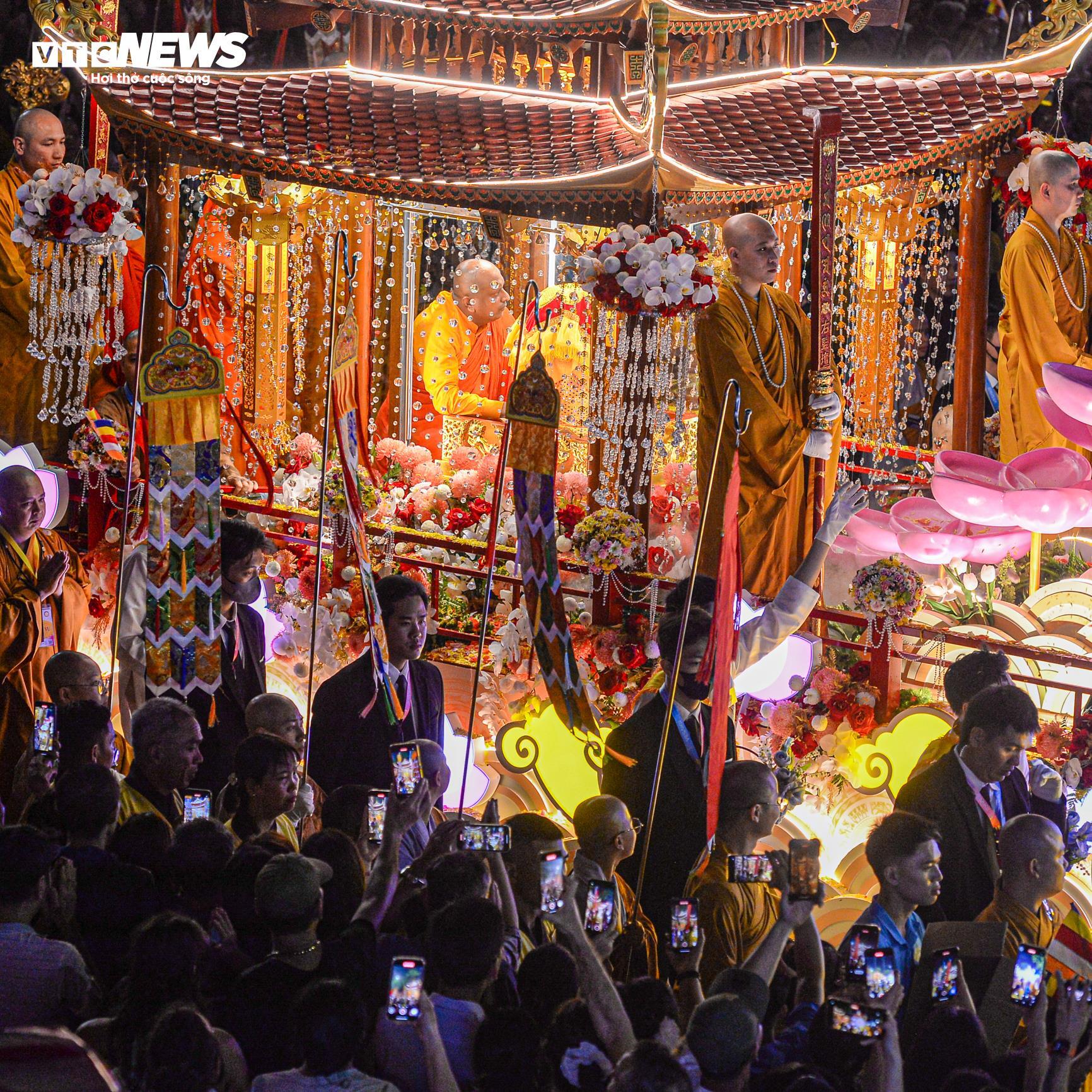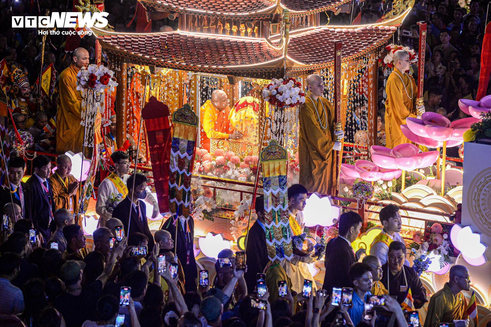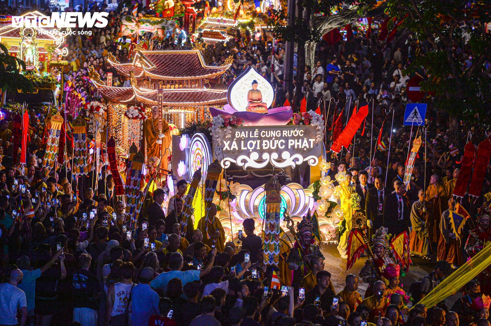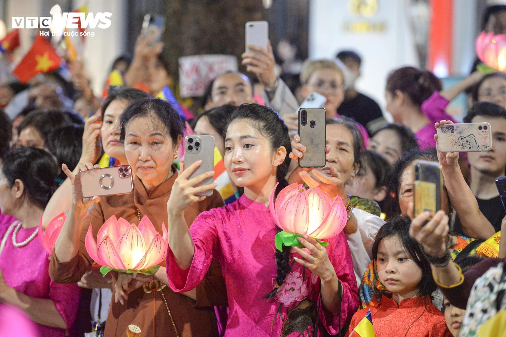 | Từ 19h, đoàn xe được trang trí công phu bằng hoa tươi, cờ Phật giáo và hệ thống ánh sáng rực rỡ bắt đầu diễu hành qua các tuyến phố: Lý Thường Kiệt, Hàng Bài, Đinh Tiên Hoàng, Lý Thái Tổ, Hai Bà Trưng… trước khi quay trở lại chùa Quán Sứ. |