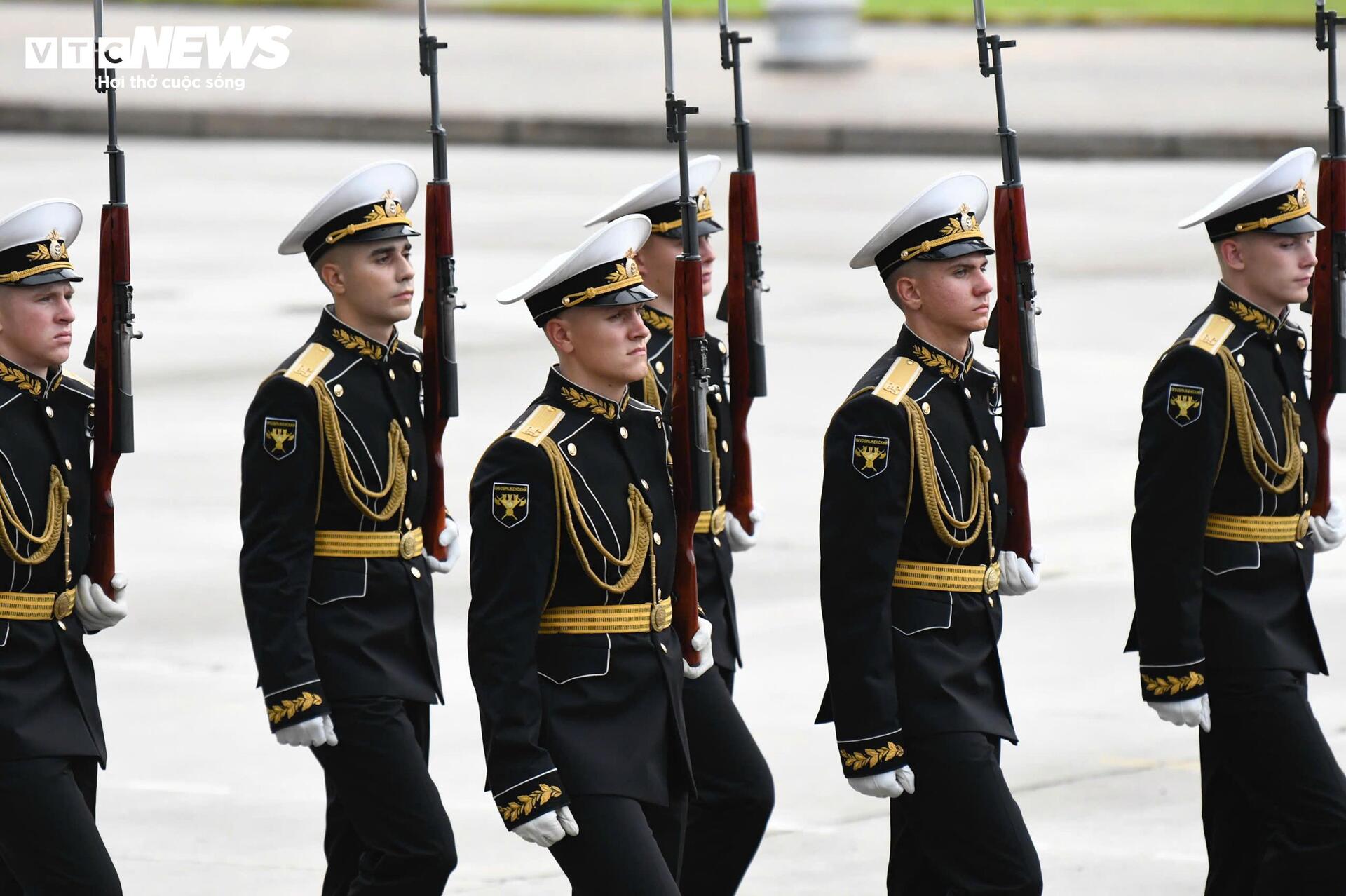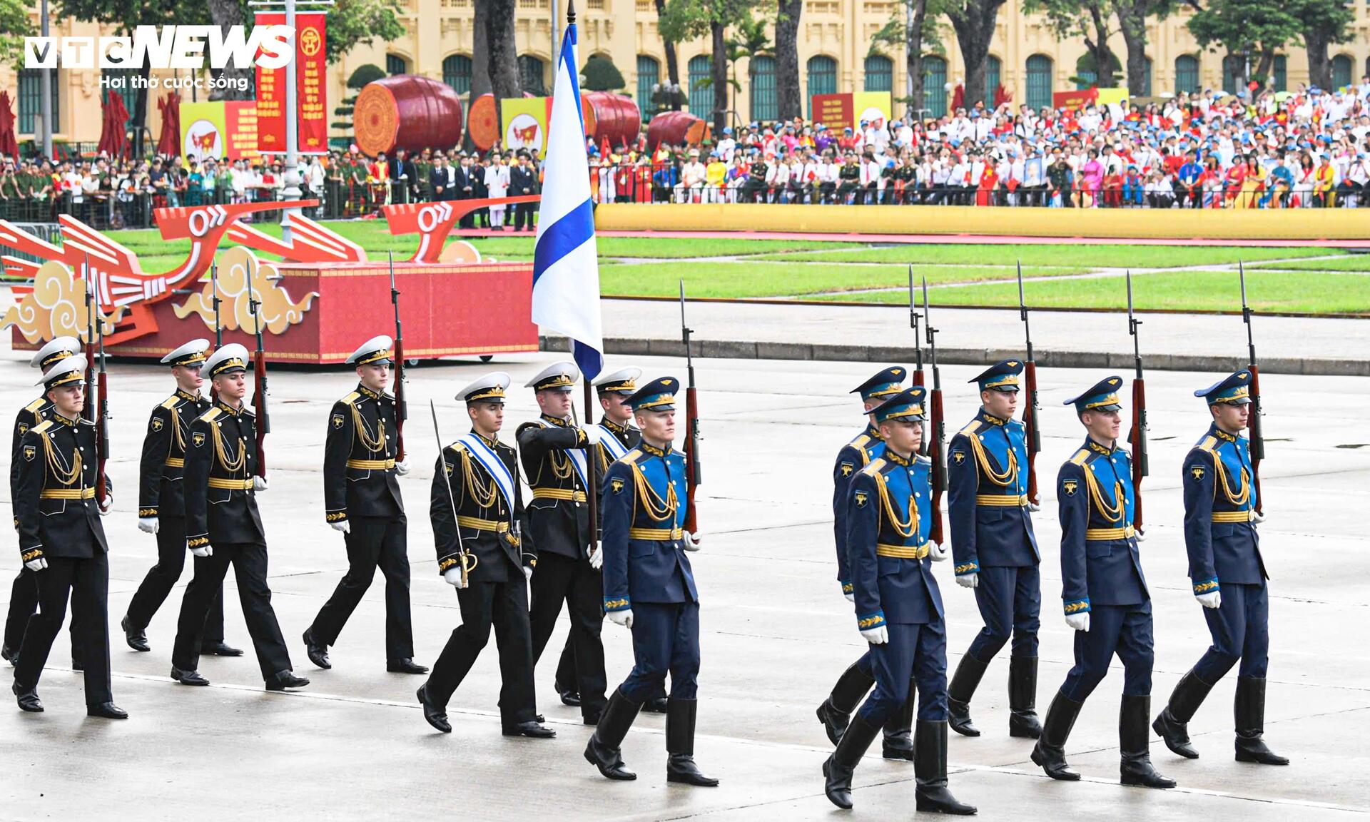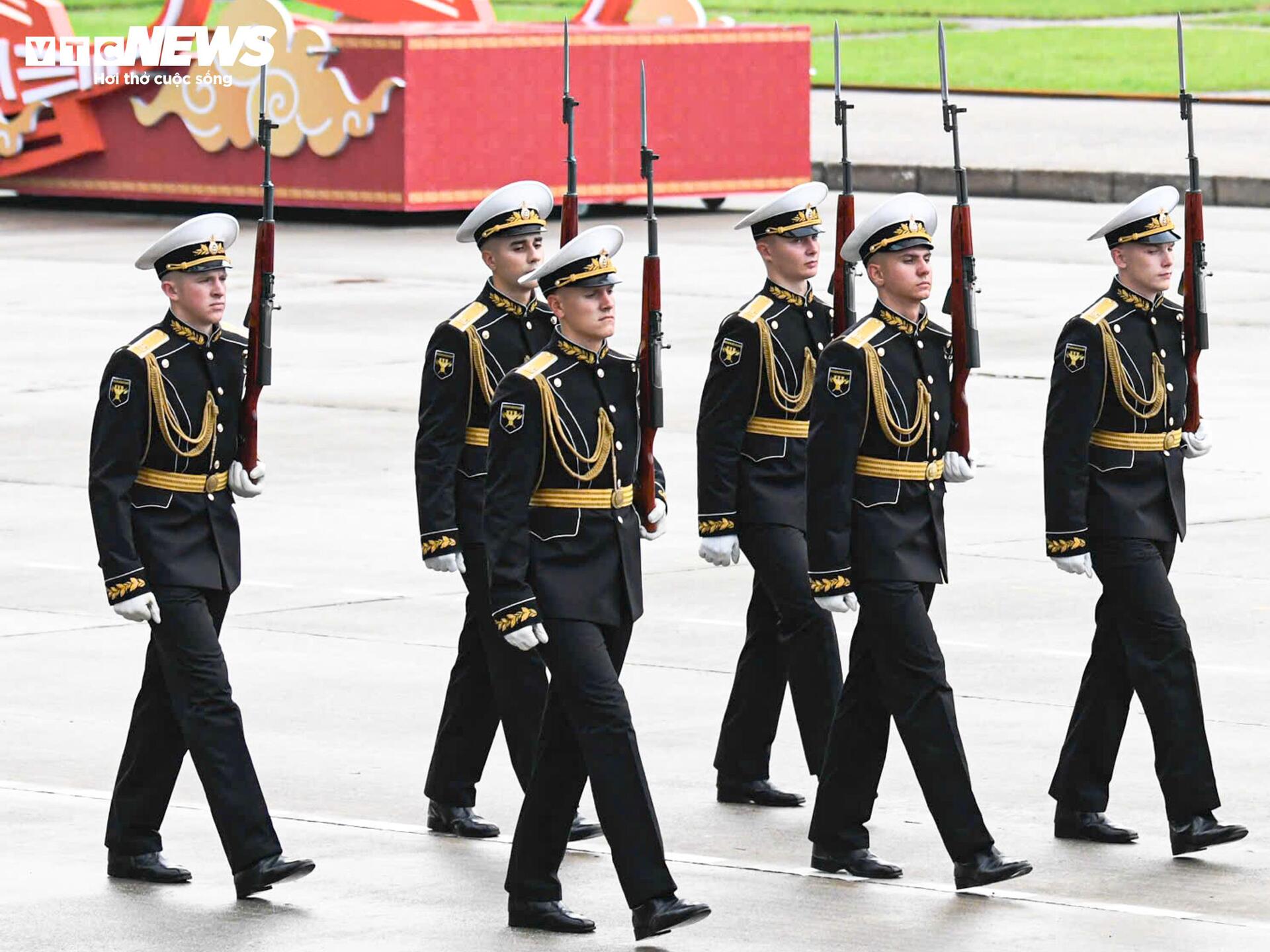 Các quân nhân Nga sải bước trên nền nhạc diễu binh Việt Nam. Họ đến Việt Nam từ ngày 20/8, trực tiếp tham gia hai buổi tổng hợp luyện tối 21/8, 24/8 và buổi sơ duyệt ngày 27/8, tại Quảng trường Ba Đình.