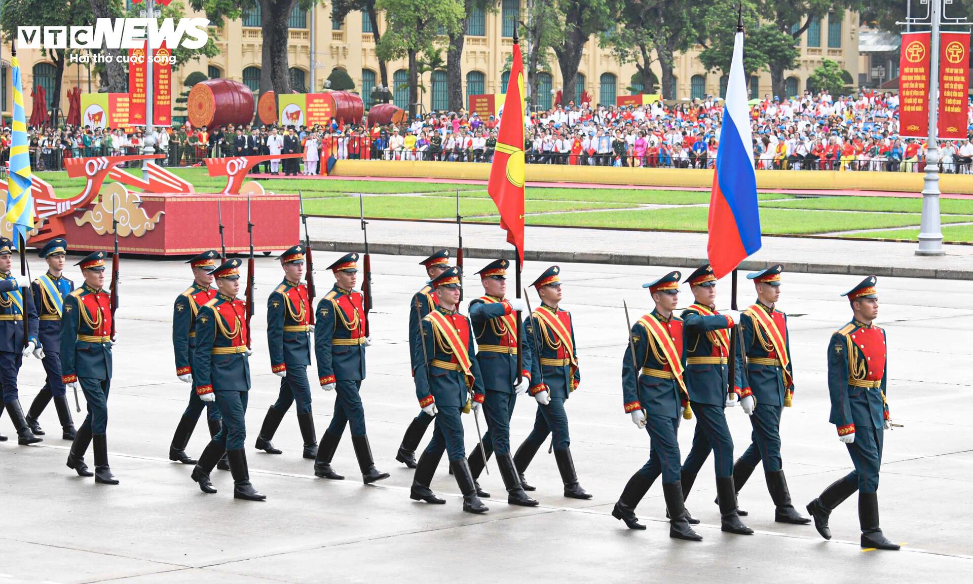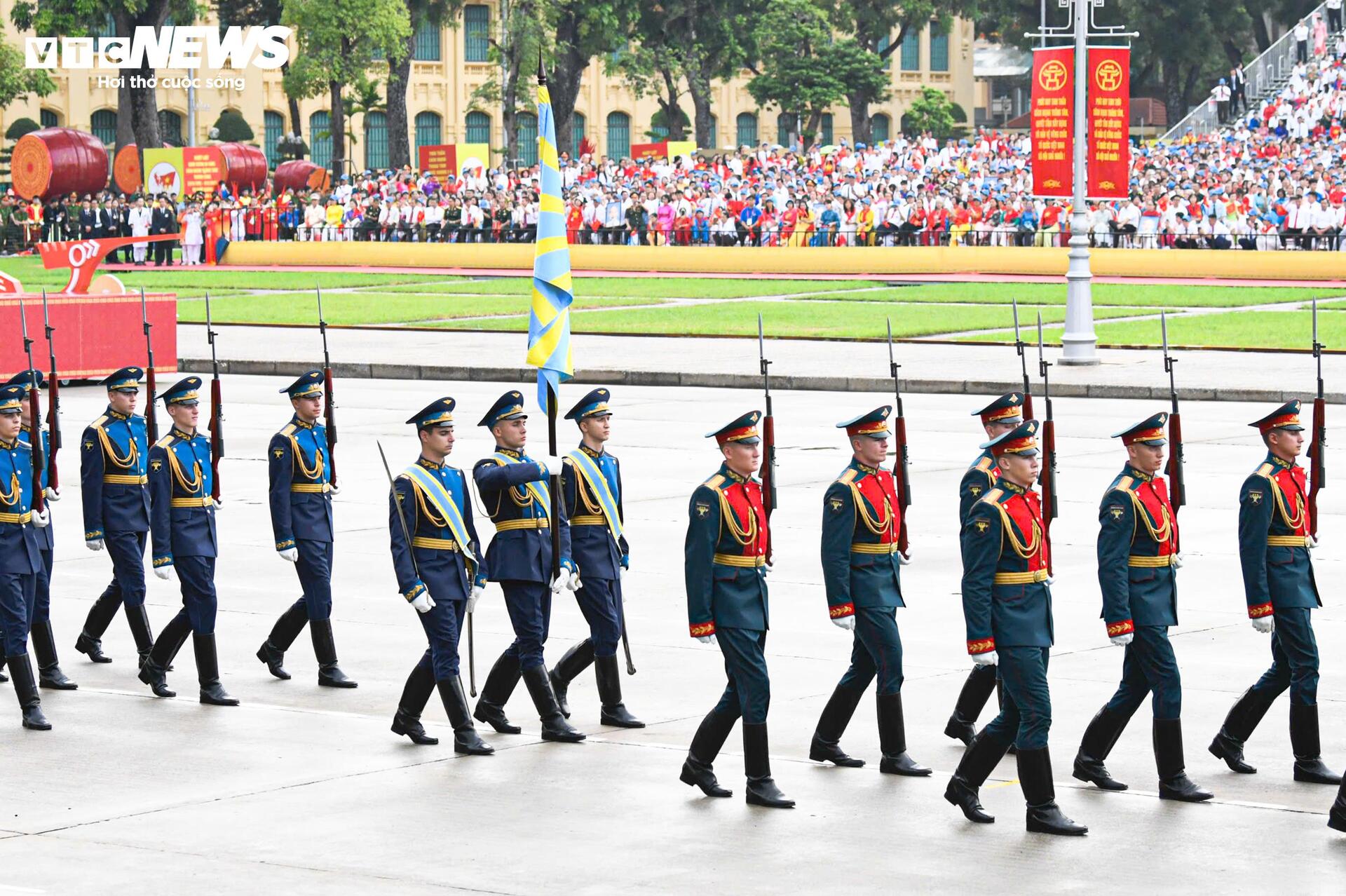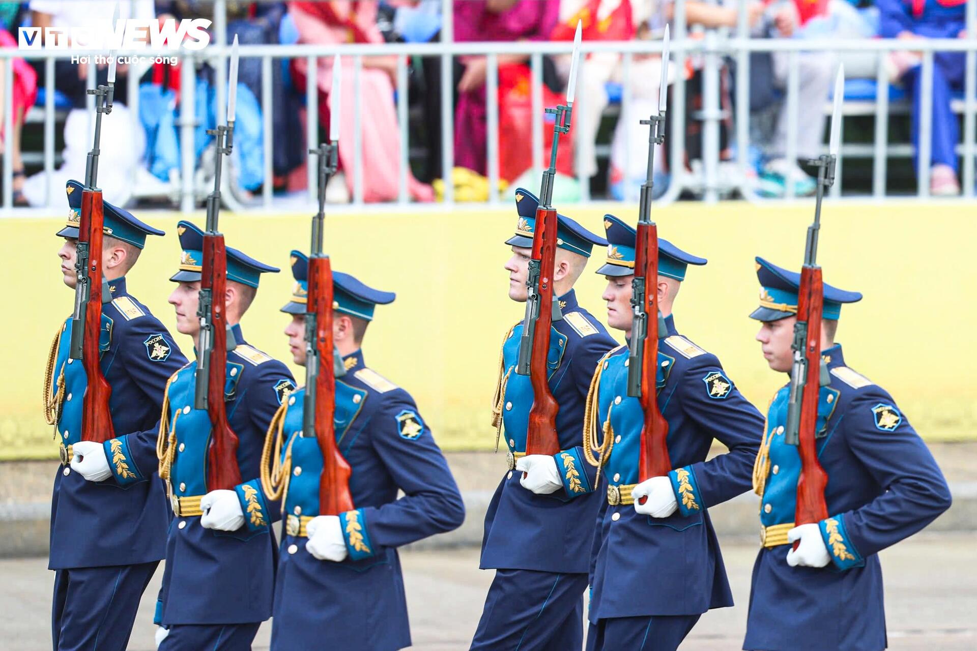 Các quân nhân Nga sải bước trên nền nhạc diễu binh Việt Nam. Họ đến Việt Nam từ ngày 20/8, trực tiếp tham gia hai buổi tổng hợp luyện tối 21/8, 24/8 và buổi sơ duyệt ngày 27/8, tại Quảng trường Ba Đình.