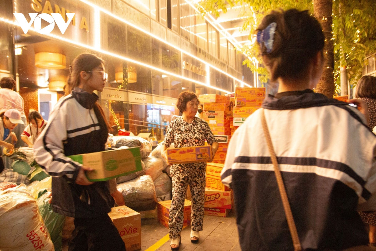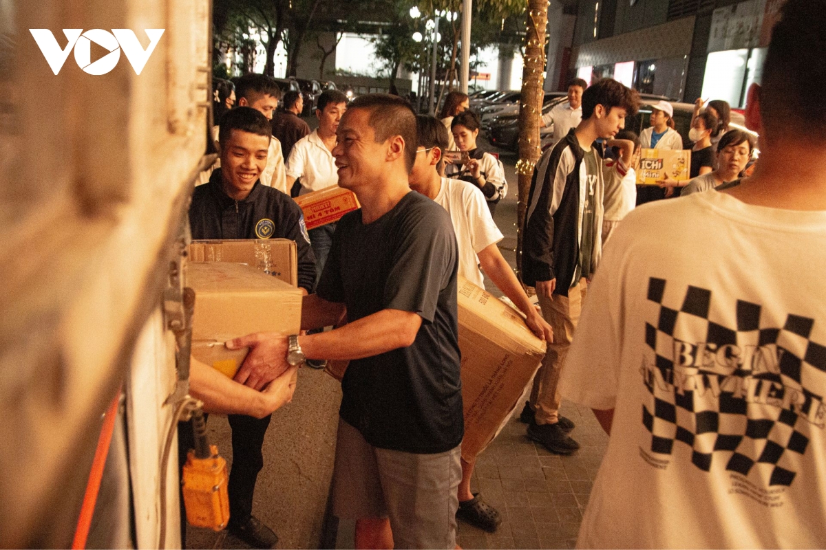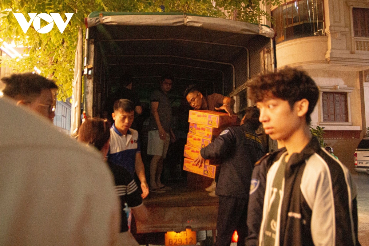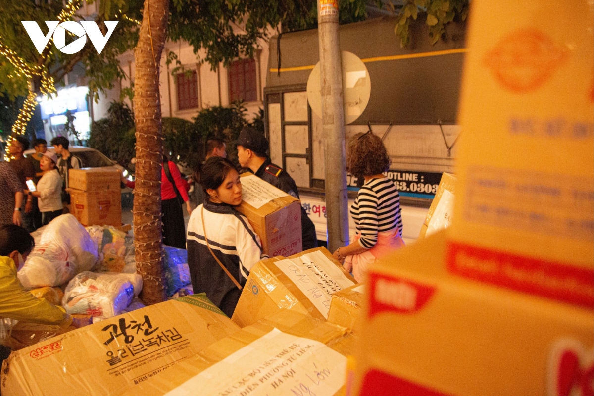 Không chỉ tại chung cư Starcity mà nhiều điểm tập kết khác trong tối 23/11 cũng nhộn nhịp không kém, khi người dân thủ đô liên tục mang quà hỗ trợ gửi tới đồng bào vùng tâm lũ. Tại điểm tập kết 360 Giải Phóng của Đội cứu hộ Hà Nội, từ sáng đến tối vẫn có đông người dân đưa hàng hóa tới, khiến khu vực luôn trong trạng thái tấp nập, khẩn trương.