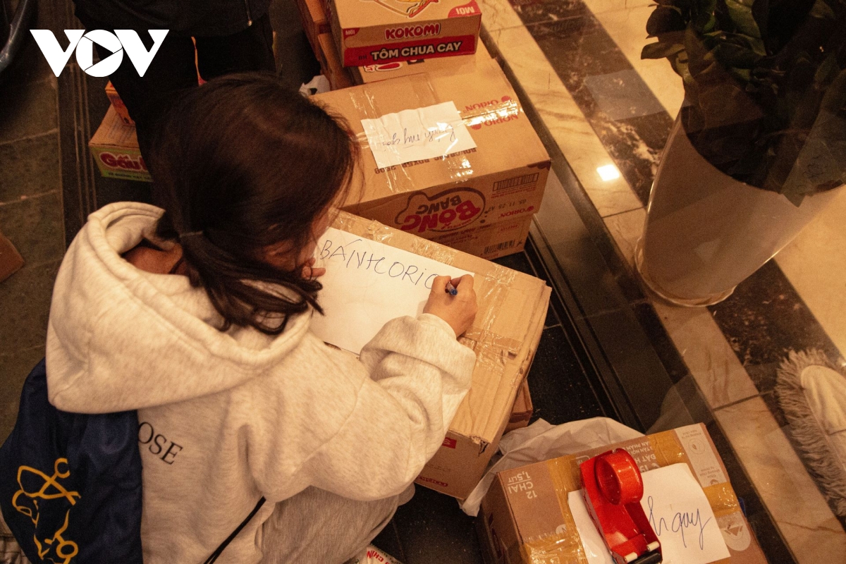 20h tối 23/11, dù là cuối tuần nhưng sảnh A chung cư Starcity (23 Lê Văn Lương) nhộn nhịp hơn thường lệ. Từng phần quà gồm các nhu yếu phẩm thiết yếu được cư dân tòa nhà và nhiều tấm lòng hảo tâm trên địa bàn Hà Nội liên tục chuyển về đây. Dự kiến sáng 24/11, toàn bộ số hàng sẽ được chuyển vào miền Trung.
