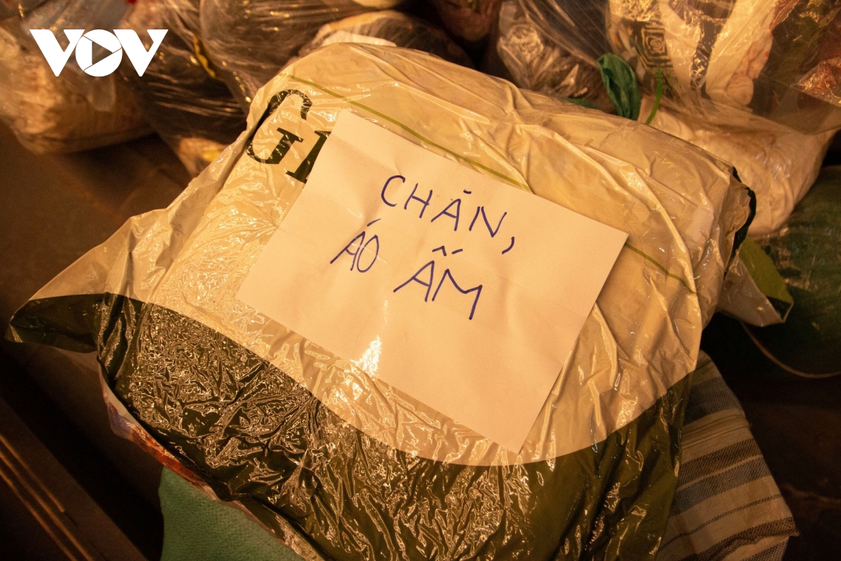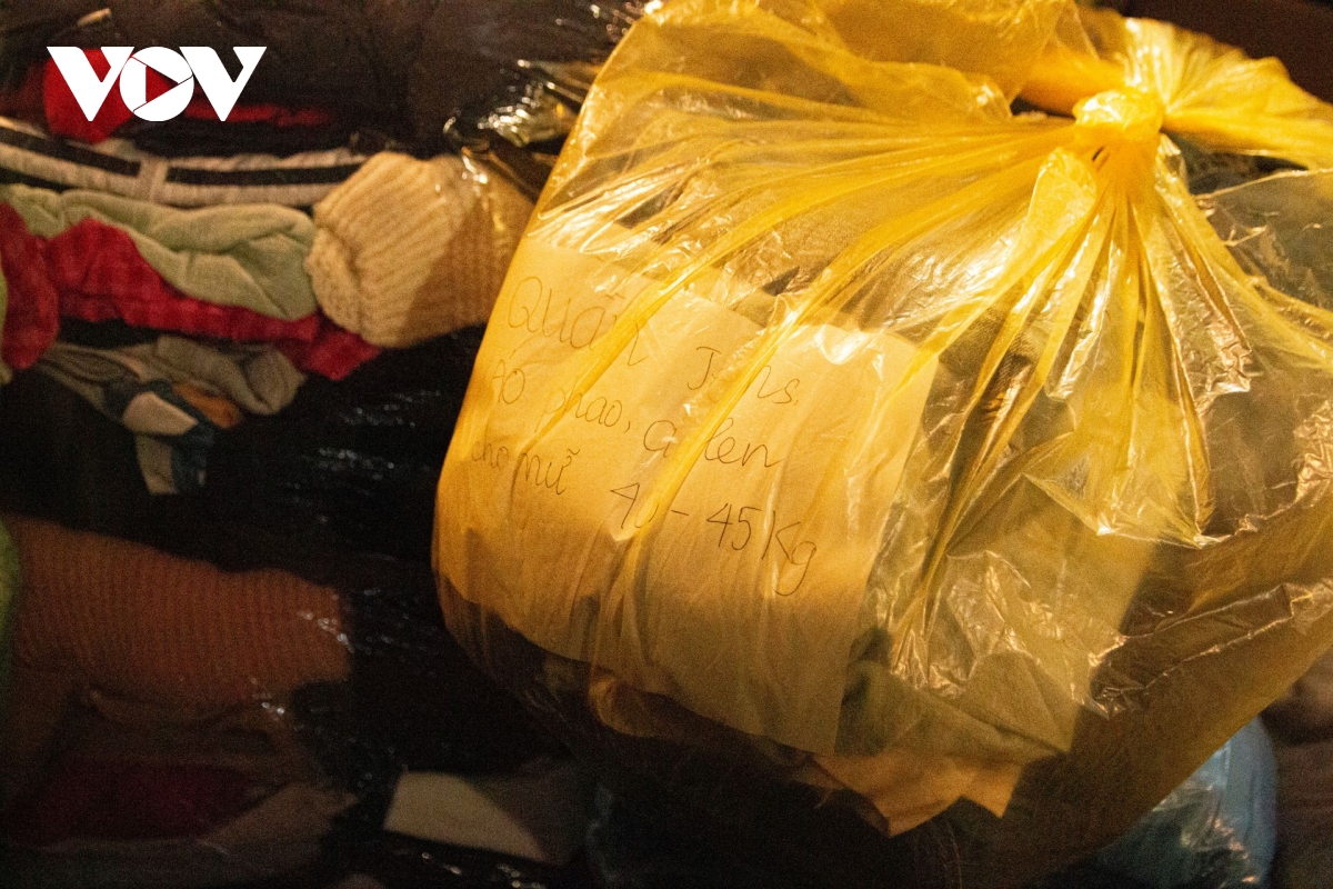 Những túi đồ được xếp gọn, phân loại rõ ràng theo giới tính, cân nặng và loại hàng. Mỗi món đồ sau đó sẽ được chuyển về kho tập kết tại 280 Lê Trọng Tấn ngay trong đêm, phân loại thêm một lần nữa và đóng gói cẩn thận trước khi đưa lên xe lớn để vận chuyển đến tay bà con vùng lũ.