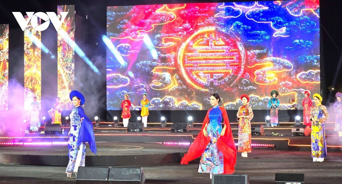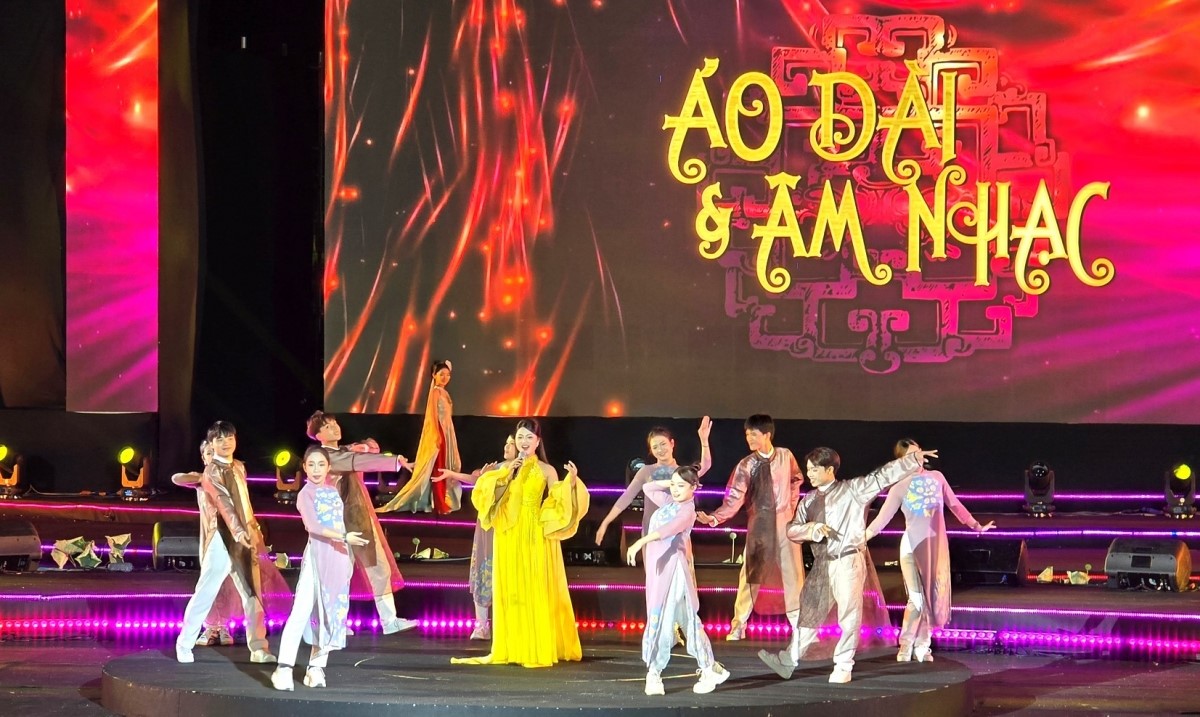 Đêm nghệ thuật “Áo dài và Âm nhạc” được dàn dựng công phu, kết hợp âm nhạc, thời trang và nghệ thuật trình diễn để kể câu chuyện lịch sử, văn hóa gắn liền với hành trình phát triển của chiếc áo dài – biểu tượng của bản sắc Việt. Ảnh: Lê Hiếu/VOV-Miền Trung |