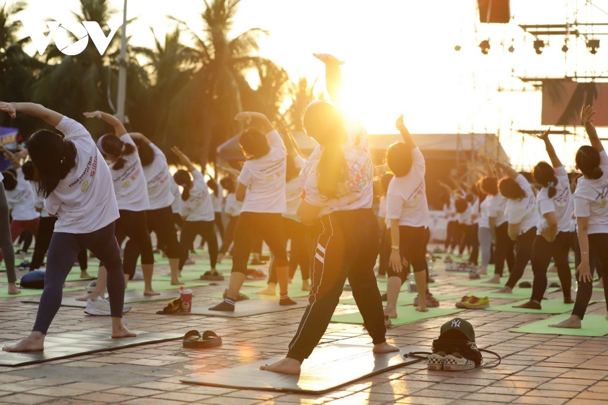 Hoạt động đồng diễn Yoga truyền đi thông điệp mạnh mẽ khuyến khích lối sống lành mạnh. Đây cũng là cơ hội để người dân và du khách kết nối với nhau thông qua hoạt động thể thao nhẹ nhàng, mang tính cộng đồng cao. Ảnh: Đình Thiệu/VOV-Miền Trung |