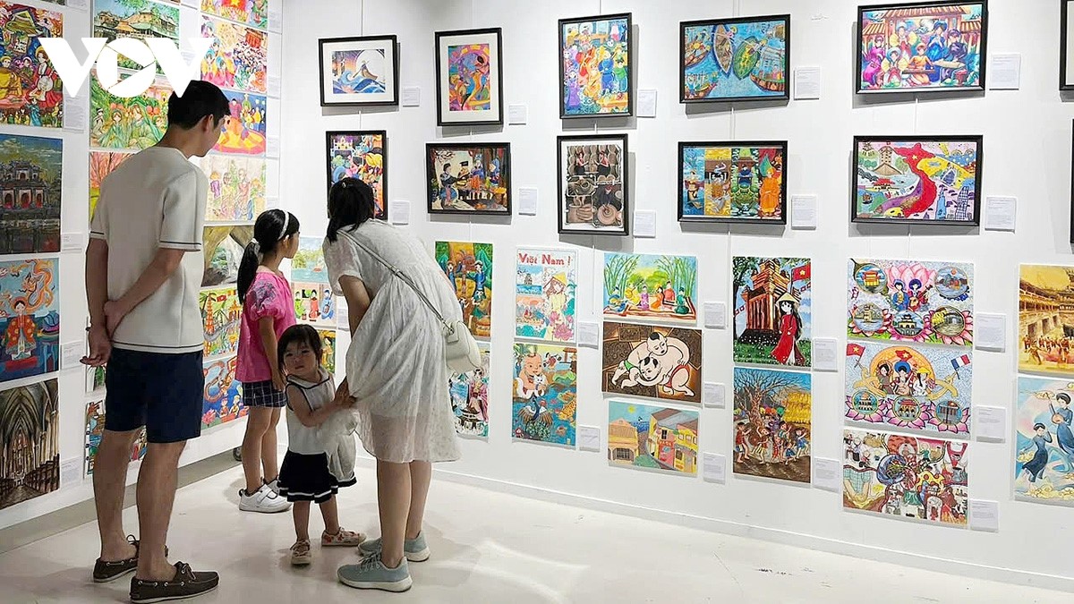 Triển lãm nghệ thuật “Rực rỡ Việt Nam” với những tác phẩm được chọn từ 1.000 bức tranh vẽ về chủ đề văn hóa Việt Nam, của các bạn trẻ gửi tới từ 17 quốc gia và học sinh Trường Quốc tế Olympia, mang đến góc nhìn chân thực, đầy cảm xúc về bản sắc truyền thống Việt qua con mắt thế hệ trẻ toàn cầu. Ảnh: Anh Tuyển/VOV-Paris |