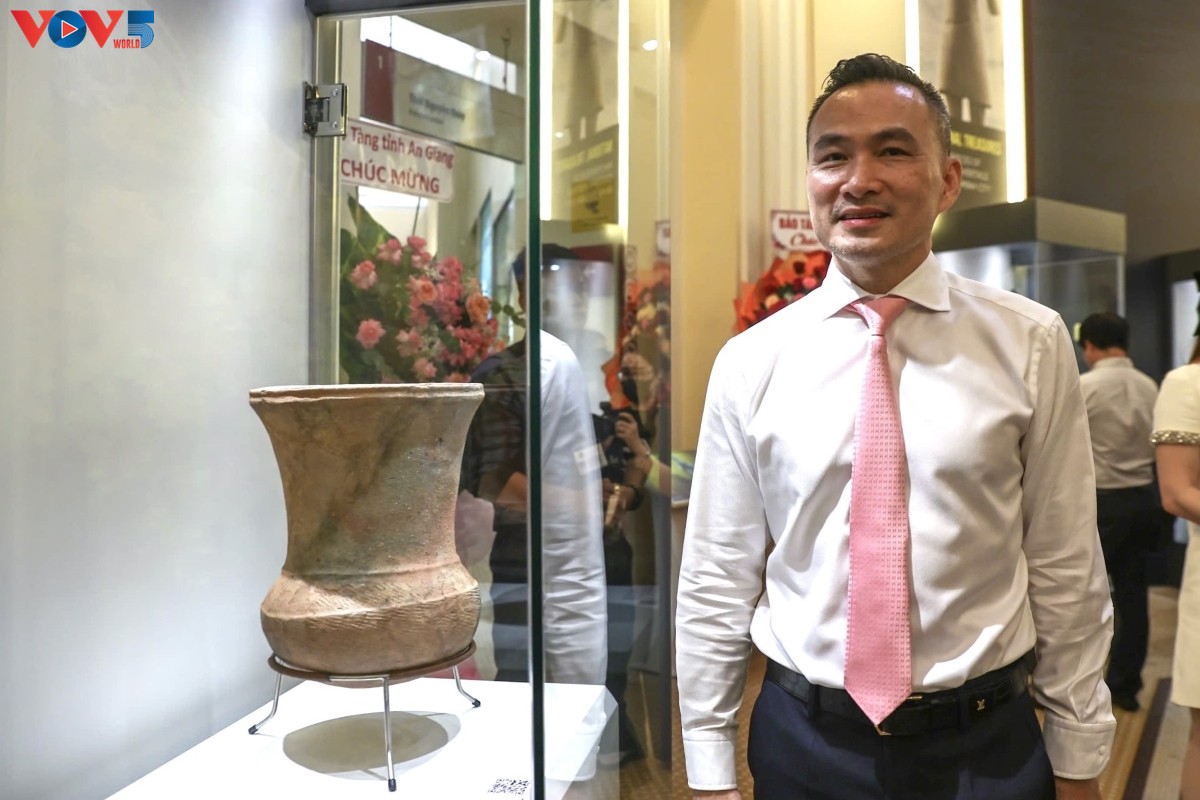 Trong dịp này, hiện vật Chõ gốm (văn hóa Đông Sơn) có niên đại khoảng 2.500 – 2.000 năm thuộc sưu tập tư nhân Phạm Gia Chi Bảo, được công nhận Bảo vật Quốc gia năm 2024, được giới thiệu đến công chúng. (Trong ảnh: Nhà sưu tập tư nhân Phạm Gia Chi Bảo cùng hiện vật Chõ gốm. Ảnh: T.Q/VOV-TP. Hồ Chí Minh) |