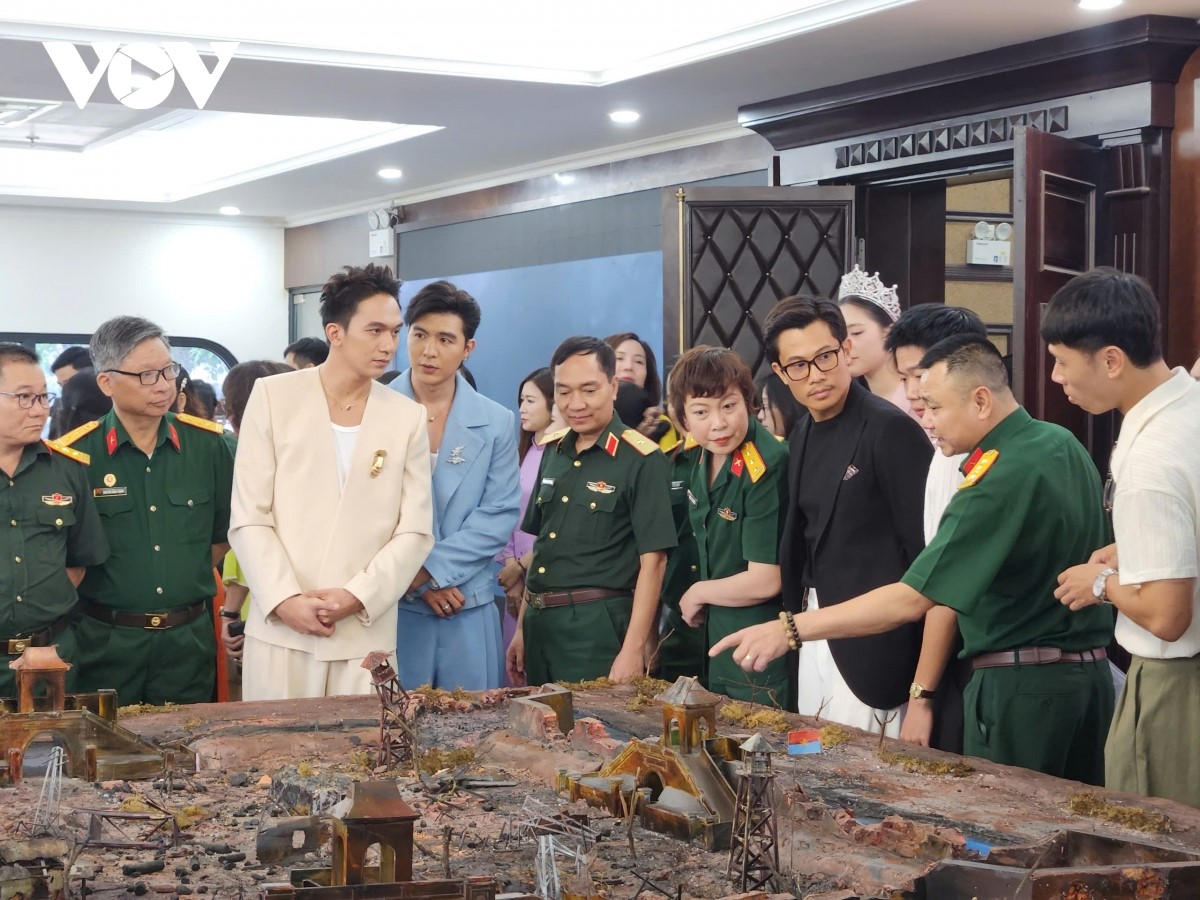 Các đại biểu tham quan sa bàn mô phỏng phim trường "Mưa đỏ". Ảnh: Hà Phương/VOV |
