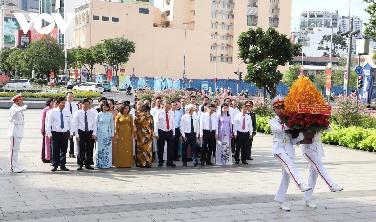 Trước lễ khai mạc triển lãm, Đoàn đại biểu đã thực hiện nghi thức dâng hương, dâng hoa tưởng nhớ Chủ tịch Hồ Chí Minh và Chủ tịch Tôn Đức Thắng, thể hiện lòng biết ơn sâu sắc đối với các vị lãnh tụ vĩ đại của dân tộc. Ảnh: Tỷ Huỳnh/VOV-TP. Hồ Chí Minh |