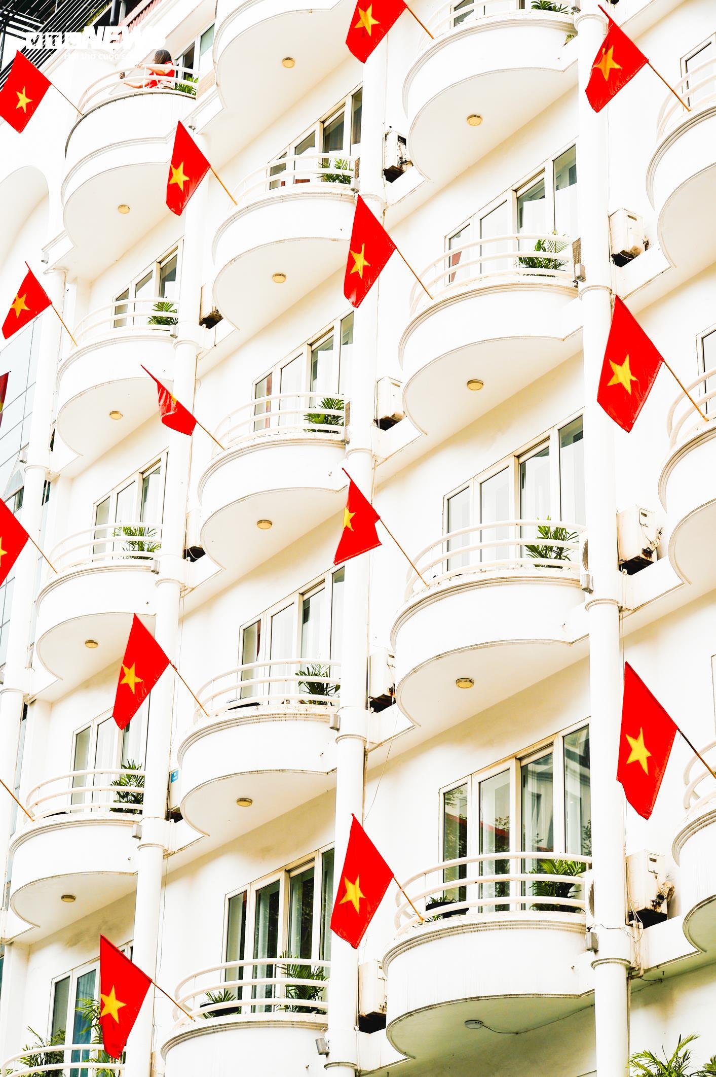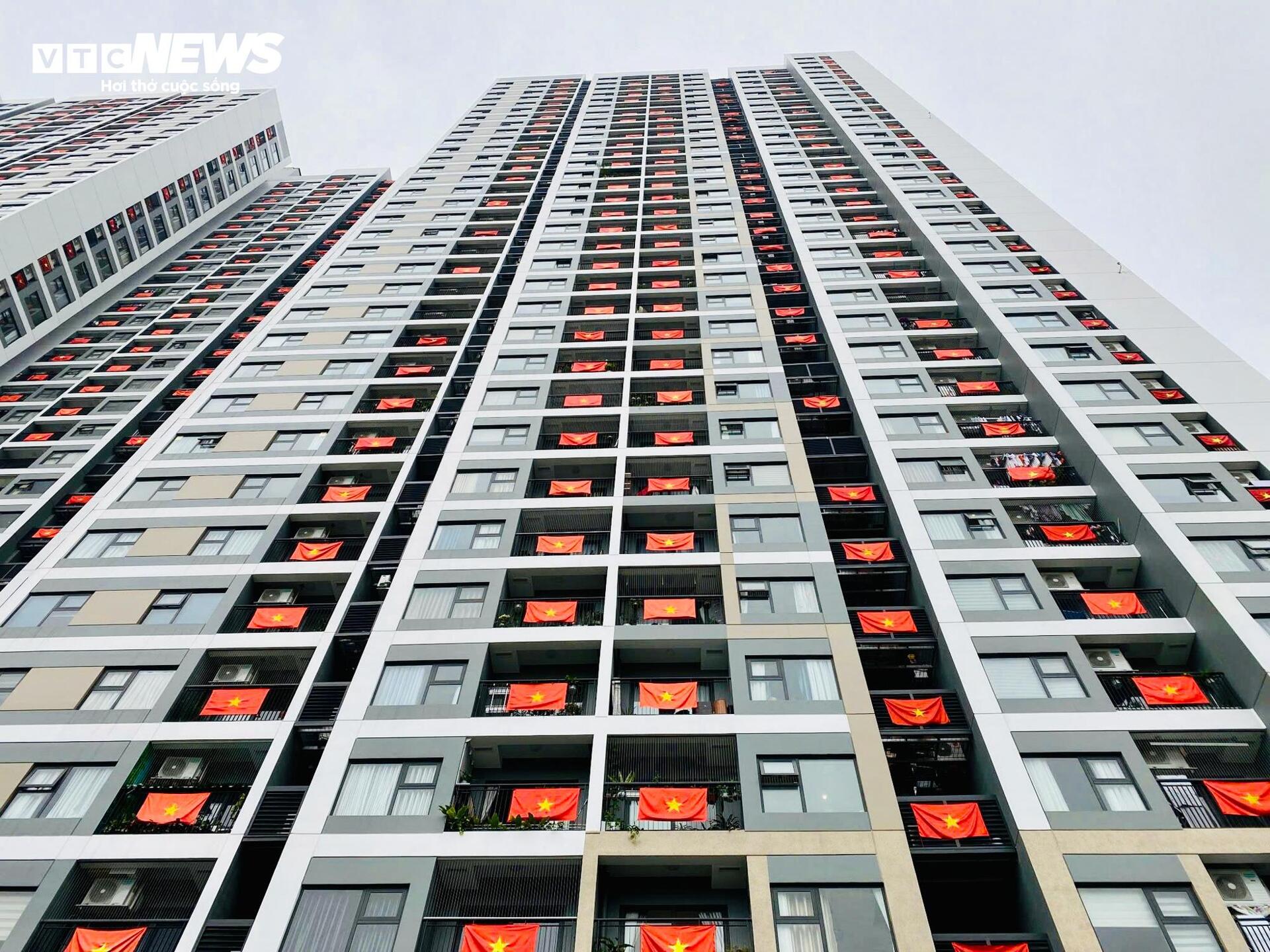 Từ ban công tầng thấp đến tầng cao, đâu đâu cũng rực rỡ sắc đỏ sao vàng. |