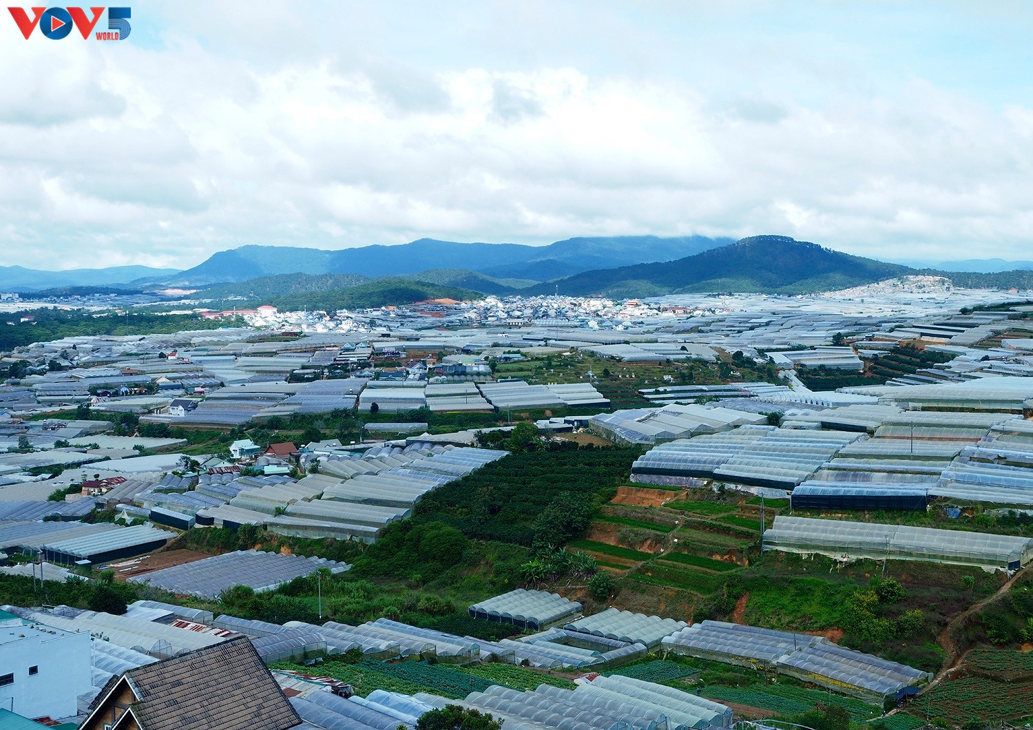 Từ trên cao phóng tầm mắt nhìn xuống khu nông trại trồng hoa và rau của Đà Lạt.