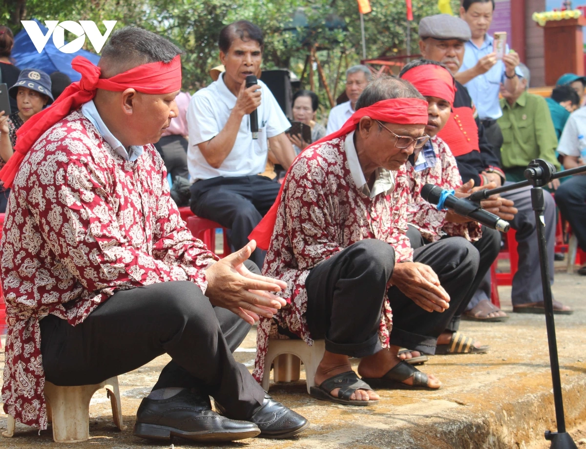 | Thầy cúng đọc bài cúng khấn gọi thần linh, ông bà tổ tiên về dự lễ và bảo vệ buôn làng, xua đuổi muông thú, thần Ác, buôn làng bình yên, người dân lên nương lên rẫy an toàn, không bị mưa giông, sét đánh. |