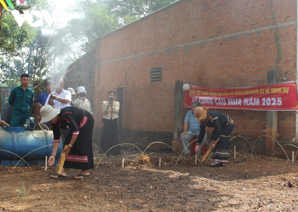 | Nghi thức trồng tỉa kết thúc khi những cơn mưa “nhân tạo” rơi xuống tưới mát ruộng đồng, gửi theo hi vọng mưa thuận gió hòa, mùa màng bội thu. Khi những giọt nước rơi xuống, mọi người cùng reo hò, thể hiện sự đồng tình và quyết tâm lao động, vui mừng vào mùa rẫy mới. |