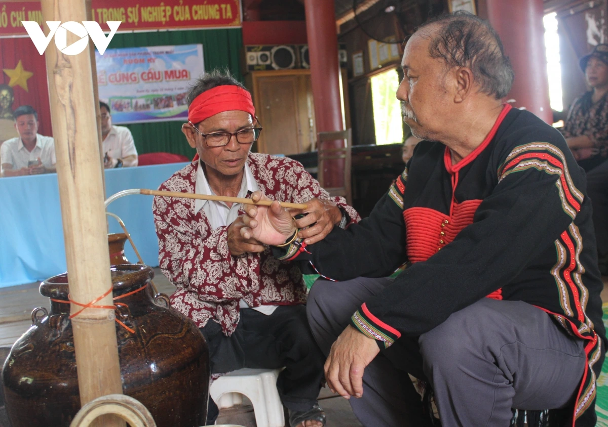 | Sau khi kết thúc nghi thức cầu mưa, mọi người di chuyển vào bên trong nhà cộng đồng, cùng làm lễ cúng mừng sức khỏe cho già làng. Lúc này, thầy cúng đeo vòng đồng vào tay già làng, cầu chúc ông có thêm nhiều sức khỏe, tiếp tục là “trung tâm đoàn kết” của buôn làng |