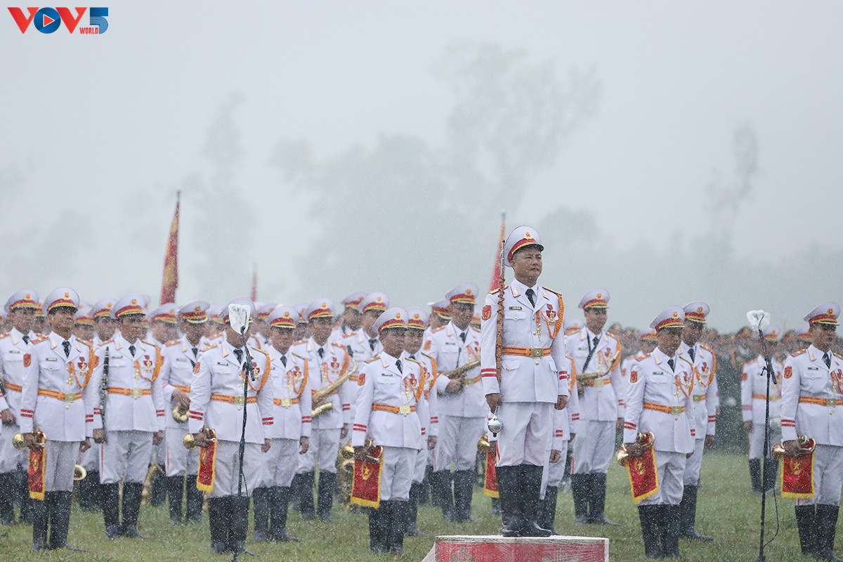 Cơn mưa rào bất chợt càng làm nổi bật khí phách hiên ngang và vẻ đẹp kiêu hùng của những người chiến sĩ. |