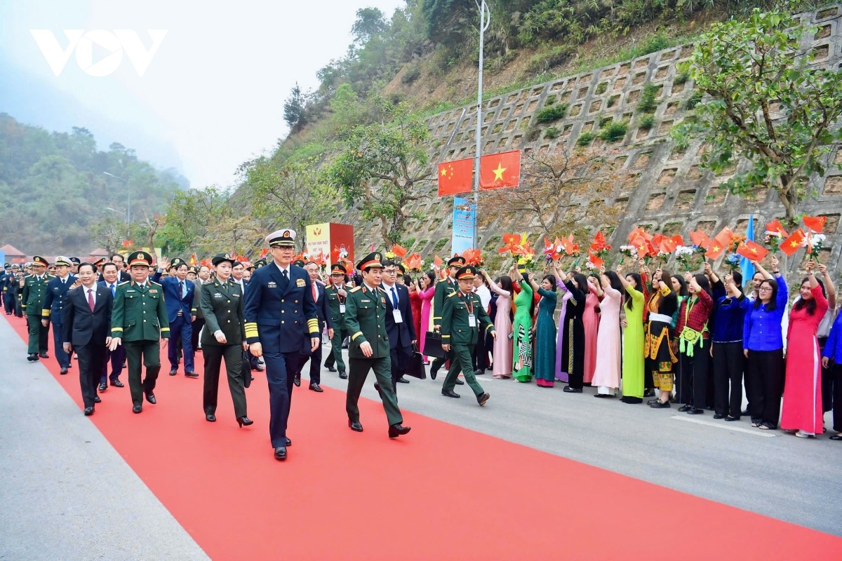 Lễ đón được tiến hành trang trọng với sự chủ trì của Đại tướng Phan Văn Giang, Ủy viên Bộ Chính trị, Phó bí thư Quân ủy Trung ương, Bộ trưởng Bộ Quốc phòng Việt Nam. Ngay khi Bộ trưởng Đổng Quân dẫn đầu đoàn đại biểu cấp cao Bộ Quốc phòng Trung Quốc bước tới đường phân định ranh giới giữa hai nước, Đại tướng Phan Văn Giang tiến ra chào đón, nồng nhiệt bắt tay Thượng tướng Đổng Quân. |