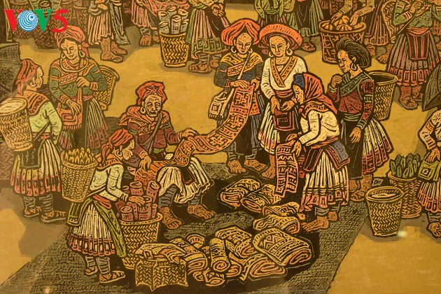 Tranh khắc gỗ " Chợ vùng cao" của họa sỹ Nguyễn Nghĩa Duyện