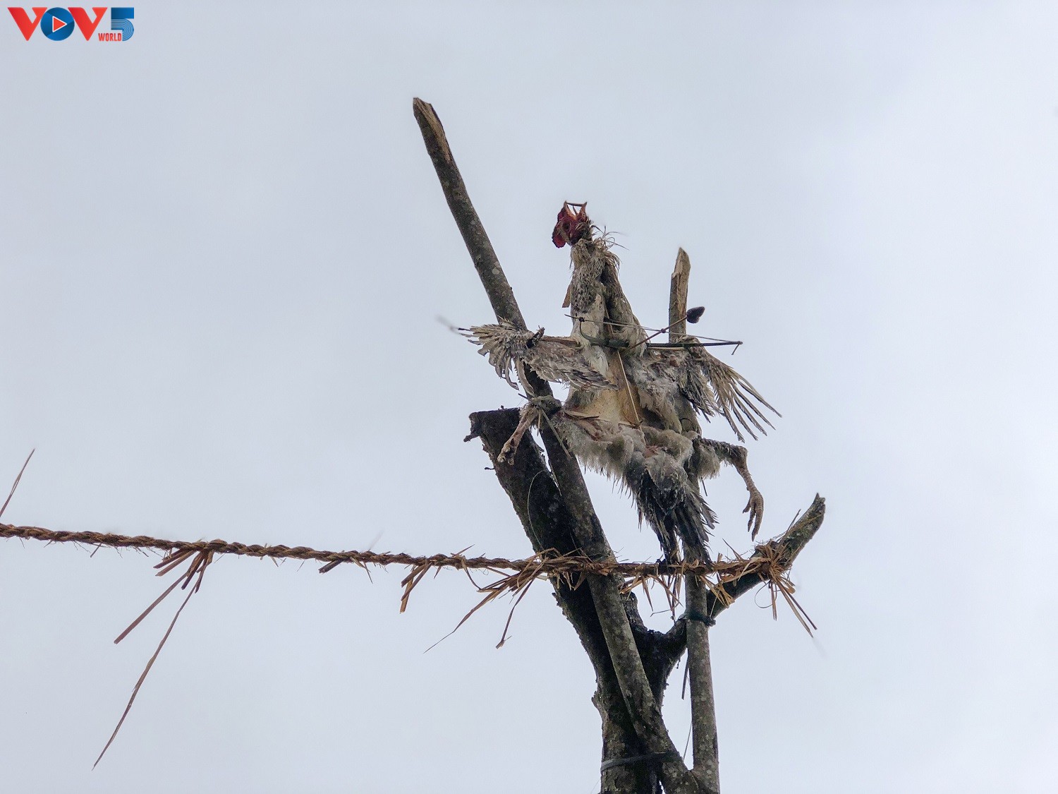 Gà sống được treo tại đầu làng để trừ ma tà vào bản.