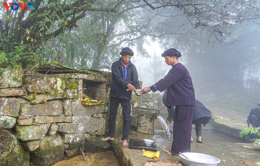 Chuẩn bị lễ vật cúng tại nguồn nước thiêng.