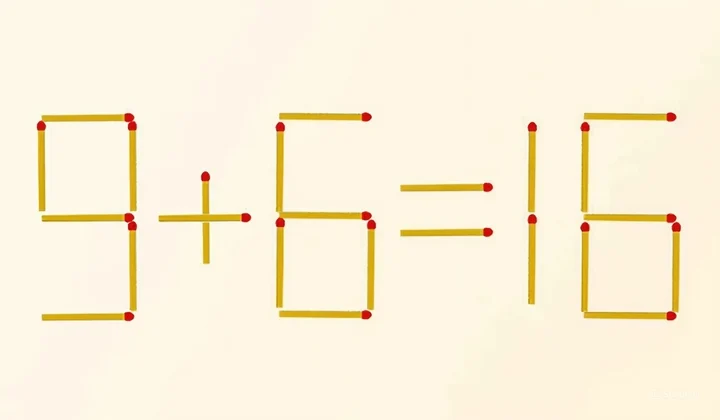 Các que diêm được xếp thành phép tính 9 + 6 = 16. Bạn hãy di chuyển một que diêm để phép tính từ sai trở thành đúng