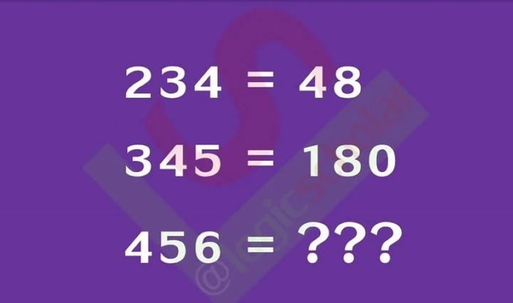 Câu đố có nội dung như sau: 234 = 48 và 345 = 180, còn 456 = bao nhiêu? Yêu cầu bạn trong 30 giây tìm quy luật và đưa ra câu trả lời. Đây là câu đố không phải ai cũng có thể tìm được ra đáp án, hãy thử tài để xem trí thông minh của bạn đến đâu.