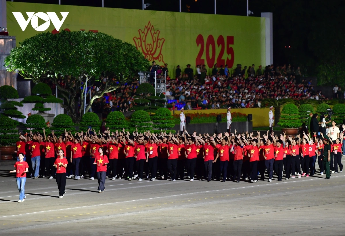 | Tối 21/8, các lực lượng tham gia diễu binh, diễu hành A80 lần đầu tổng hợp luyện trên Quảng trường Ba Đình. |