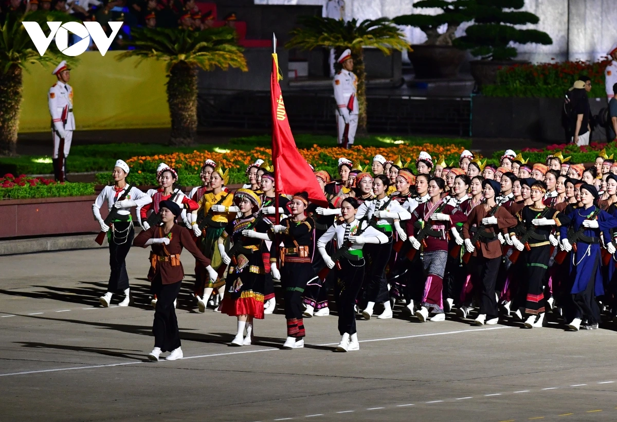 | 14 khối xe pháo quân sự, đặc chủng của Quân đội và Công an nối nhau tiến vào Quảng trường Ba Đình theo đường Hùng Vương, tạo nên khung cảnh hùng tráng. |