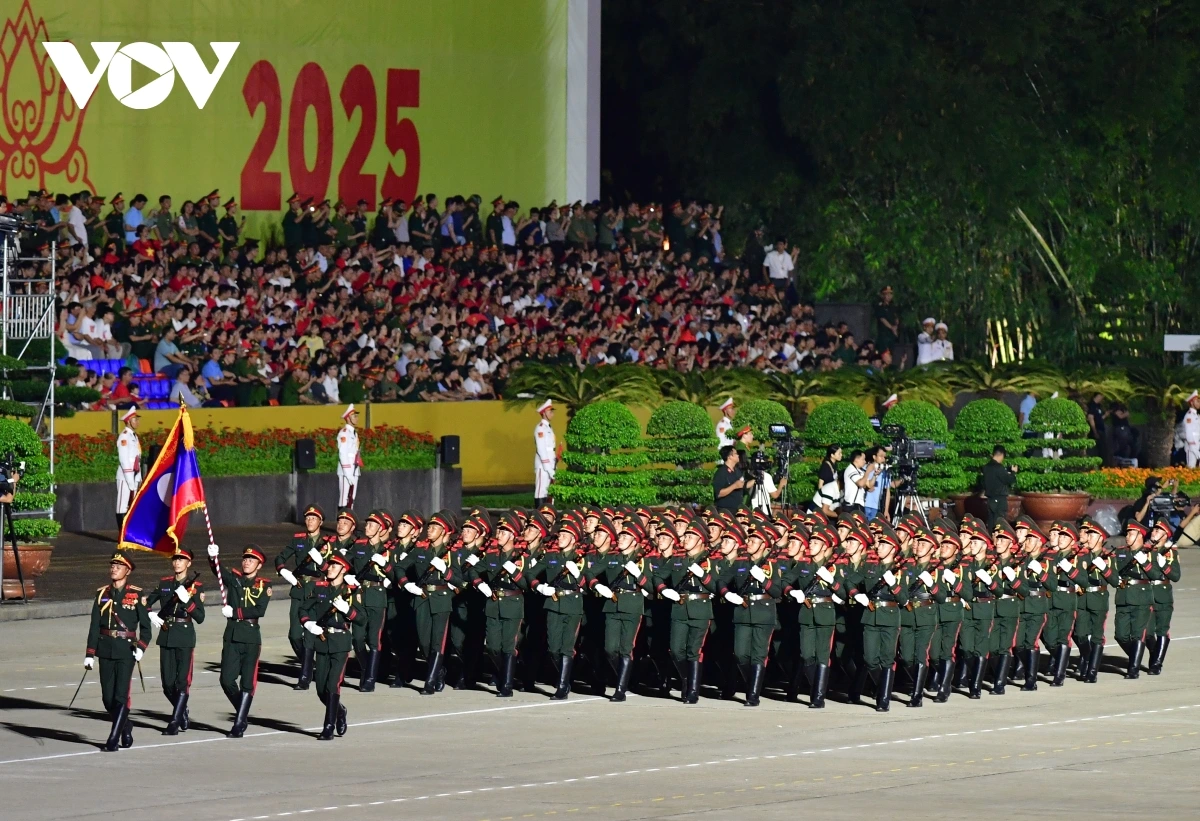 | Buổi tổng hợp luyện tối 21/8 còn có sự góp mặt của 3 khối quân đội nước ngoài. Trong số này, dẫn đầu là khối quân nhân Nga. |