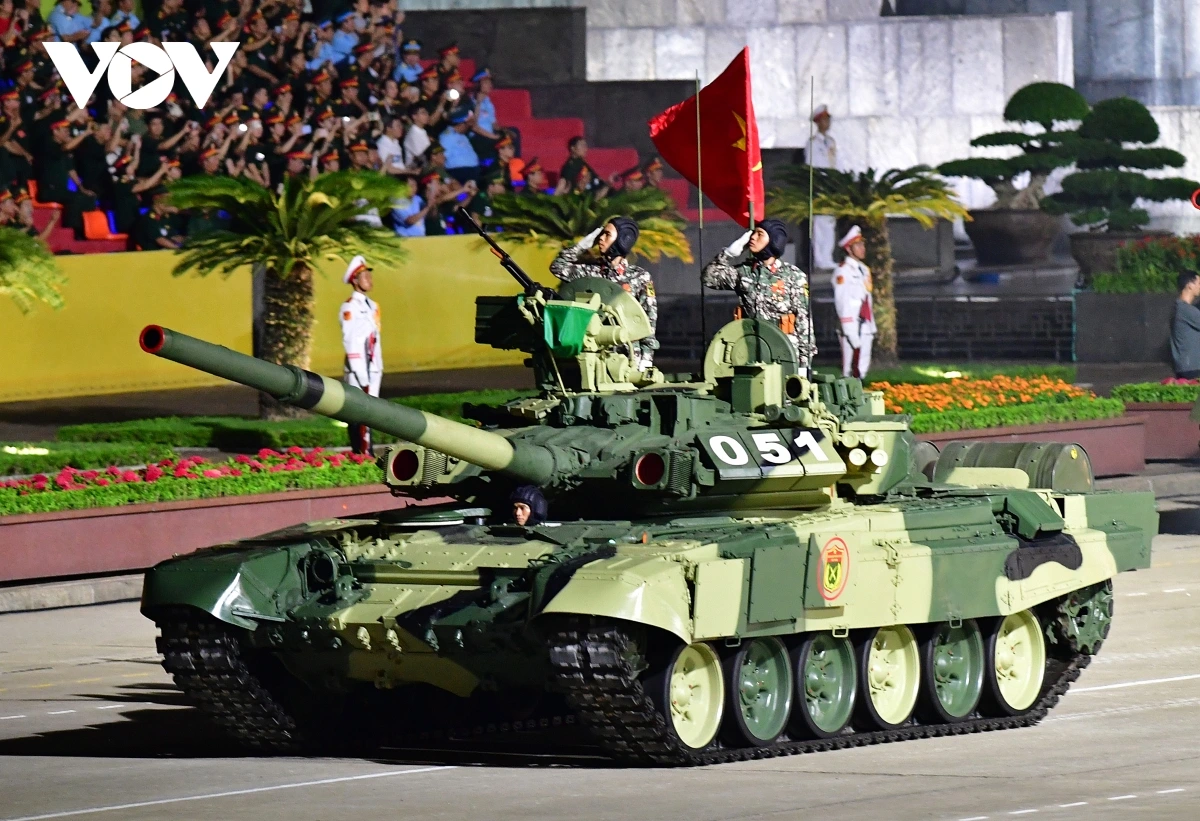 | Sau khi các khối đi bộ và khối Cảnh sát cơ động kỵ binh tiến qua lễ đài, các khối xe pháo quân sự, xe đặc chủng xuất hiện trên Quảng trường Ba Đình. |
